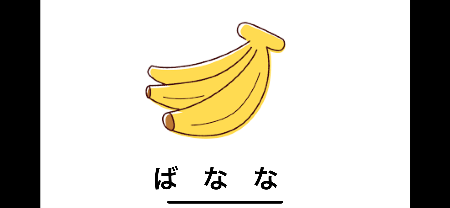 2:アプリ「Keynote」、ひらがなカードを用いて授業を展開する。 (1)①のスライドを提示し、児童に名称を問い (2)ひらがなカード「ば」「な」「な」の3枚を無作為に提示し、 正しい文字順に並び替え、単語をつくる。 (3)③④含め、その後同様。 |