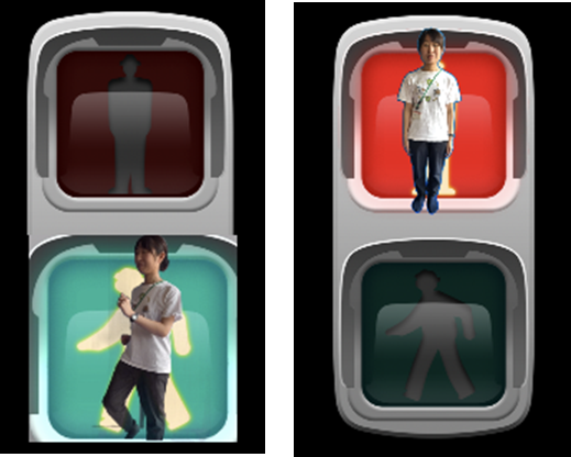 【成果】 ・指導者が電子黒板に映ることで、興味関心をもって見る児童も多かった。 ・指導者を見て模倣ができる児童は、画面を見て歩く、止まる動きができた。 ・最後に指導者が映っていない信号でも、同じように歩く、止まるの動きができる児童もいた。 【課題】 ・教室内での取り組みを活かし、実際の信号機を使って実践することで、より実生活に結び付いた学習活動になると考える。 |