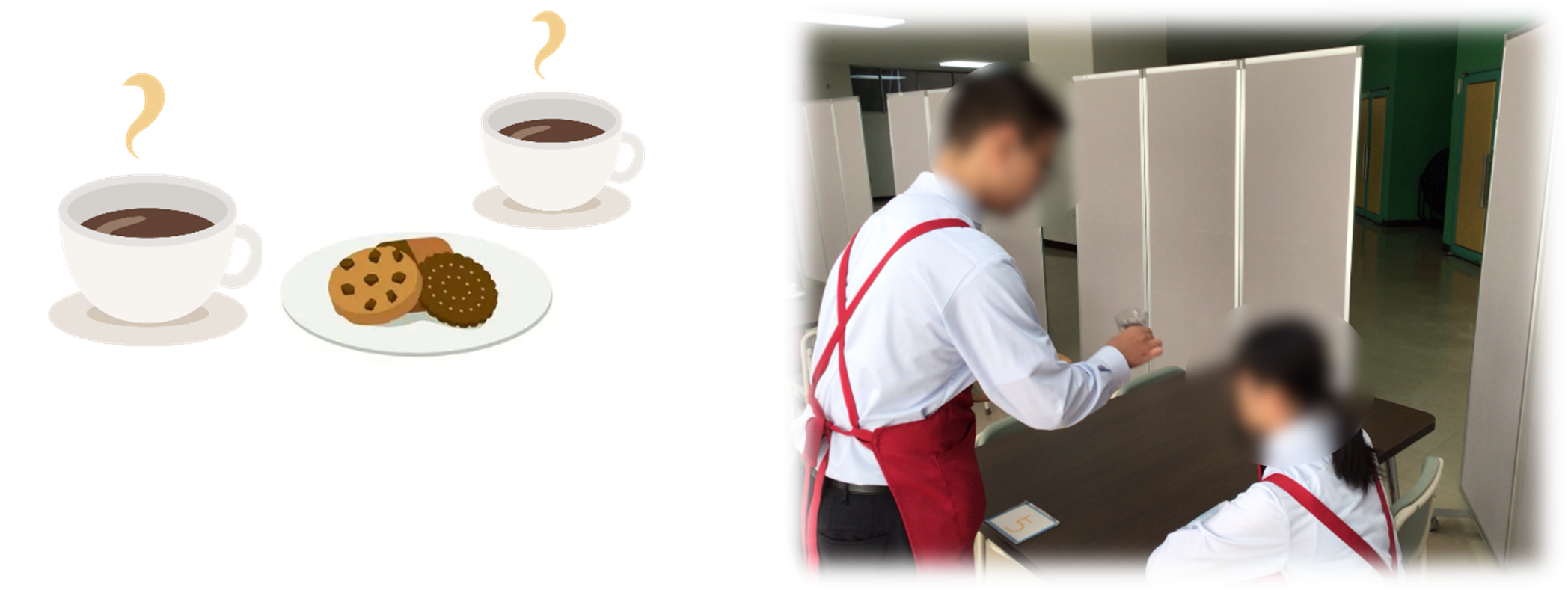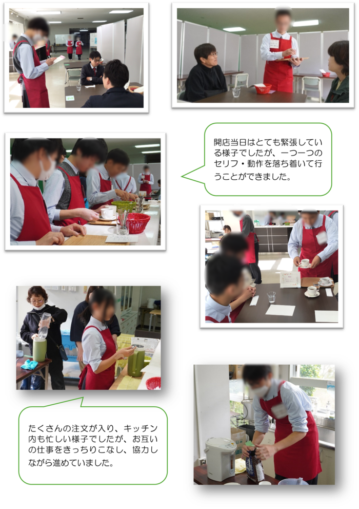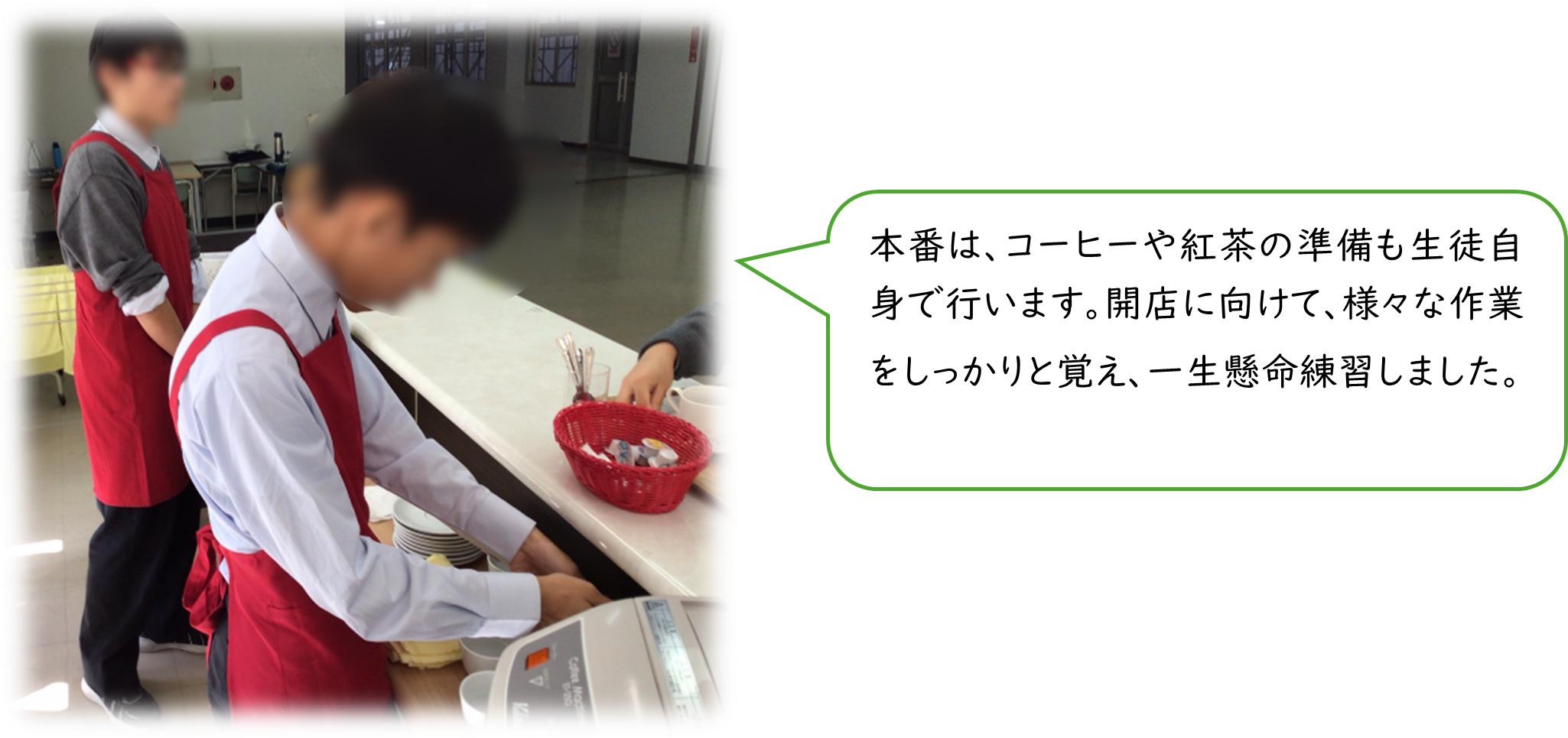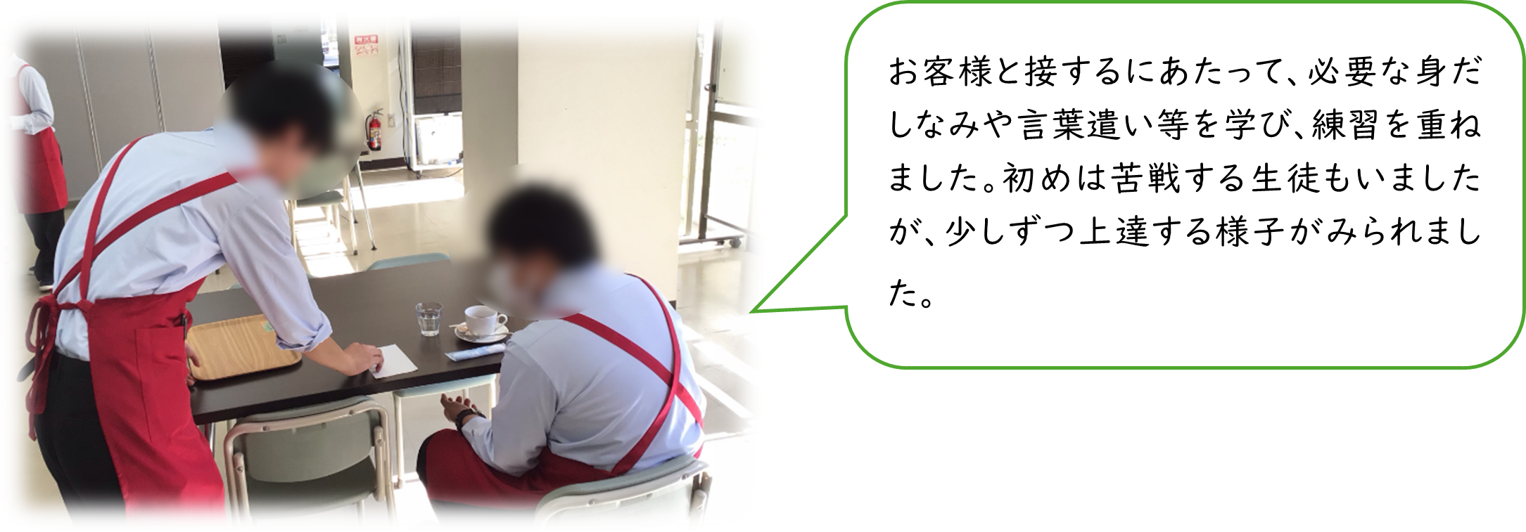 接客・販売の授業では、喫茶サービスの提供を経験することで、人と関わる力や社会参加への自信と意欲を育むことを目的としています。