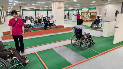 車いすの乗車体験では、操作の難しさや、段差や勾配のある道を走行した時の揺れや振動を体感する