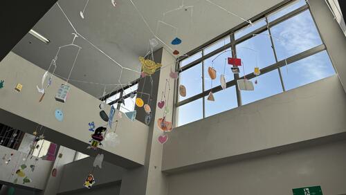 【中学部2年生「美術」の作品です。玄関ホールに展示されています】