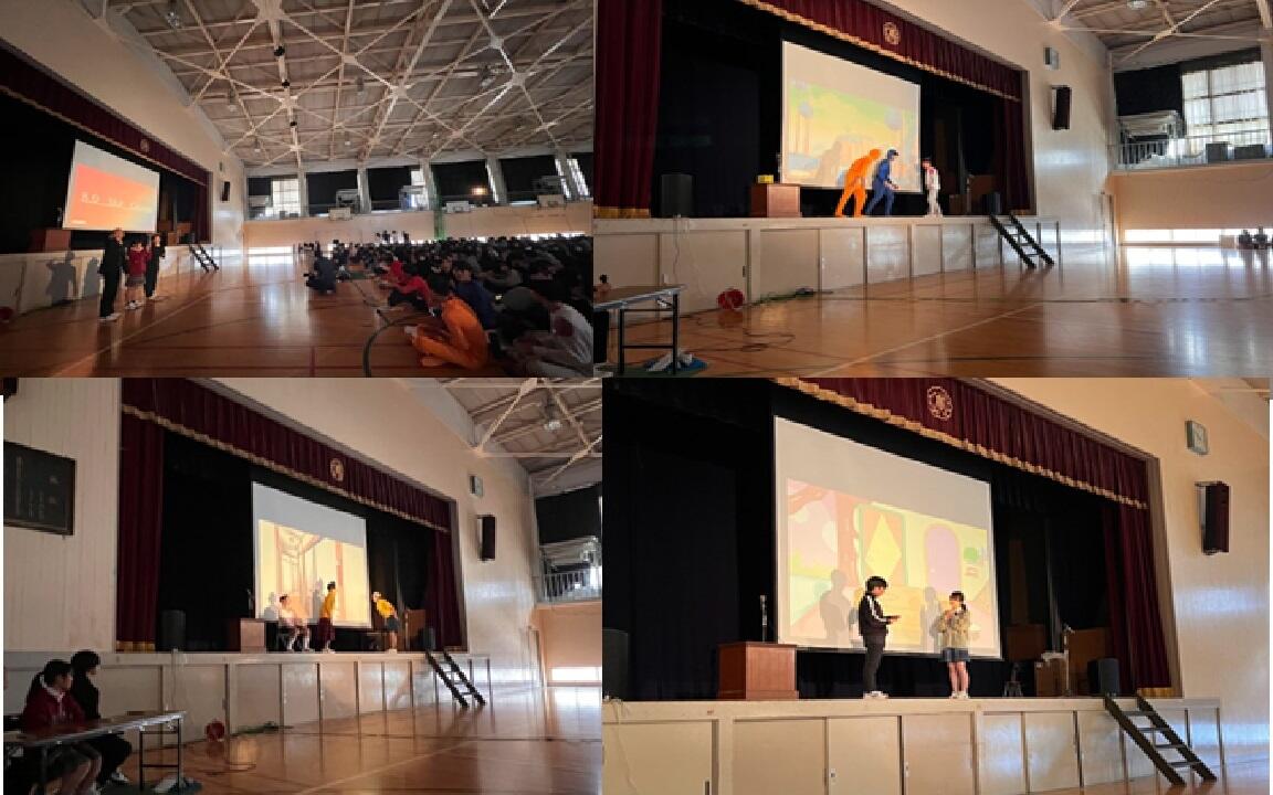 10月18日にスキットコンテストが開かれました。クラスの代表がアニメや映画をもとに自分たちで物語を創作し、英語で発表していました。優勝したクラスは1年7組で「Dragon Ball」です。スキットコンテストが終わったあと、「面白かった」や「楽しかった」などの声がたくさん聞こえてきました。