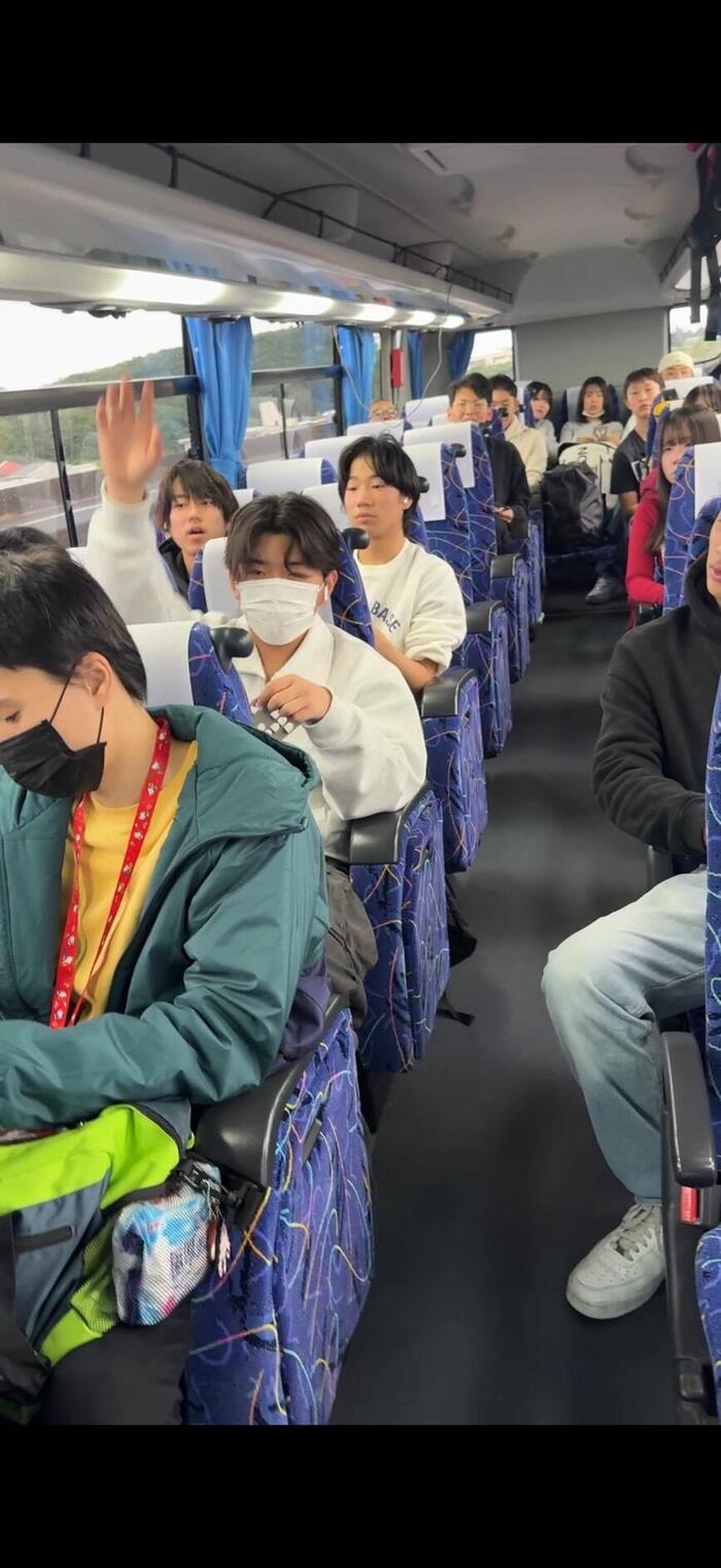 もうすぐ古宇利大橋に到着です。道中はカラオケやクイズなど各クラスで楽しんでます!!