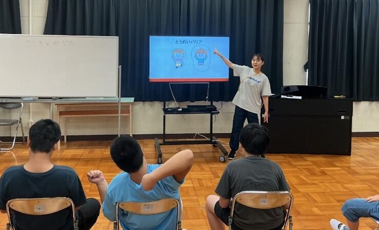 10月1日中学部1年生では、4つのグループに分かれて「こころとからだ」の学習を行いました。2グループではウォーミングアップで「手形足形ゲーム」をして、体の使い方などゲームを通して学びました。後半は養護教諭とともに「プライベートゾーン」「人との距離感」について、クイズを交えながら、楽しく学びました。子どもたちもいつもより少し緊張感を持ちながら、養護教諭の話を聞く様子が見られました。