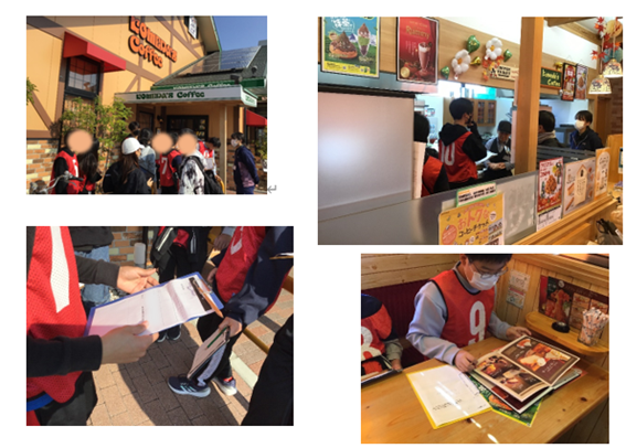 11月19日(水)中学部2年生で地域交流(2回目)を実施しました。前回と同様、地域清掃を行ったあと、コメダ珈琲羽曳野西浦店へ見学にいきました。調理工程やお客様とのコミュニケーションなどを見させていただきました。事前に考えていた質問を店員さんにすると、笑顔で回答していただくことができ、よい体験ができました。また、テーブル席にグループで座り、メニューやテーブルセッティングを見ながら気づいたことをメモに書きとりました。それをもとに、今後は総合の時間で商品のPOPを作り、お店の方々に受け取っていただく予定です。