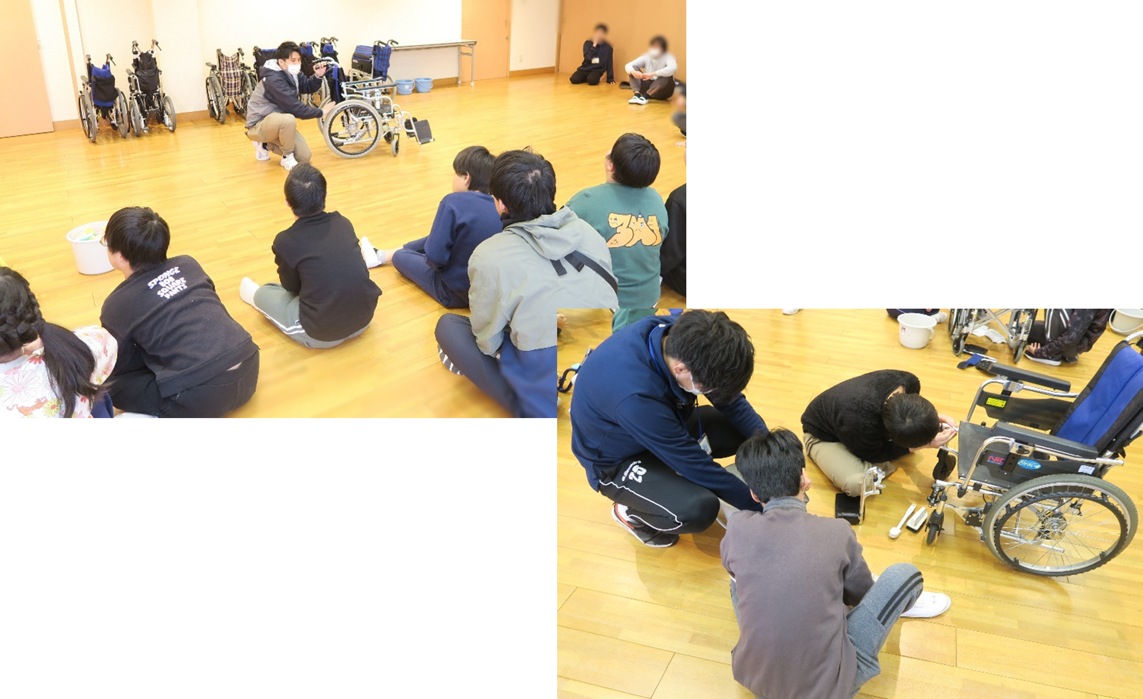 作業を開始する前に施設の職員の方から、車いすについての説明をしっかり聞き「よしがんばるぞ」という姿勢が生徒の表情によく表れていました。