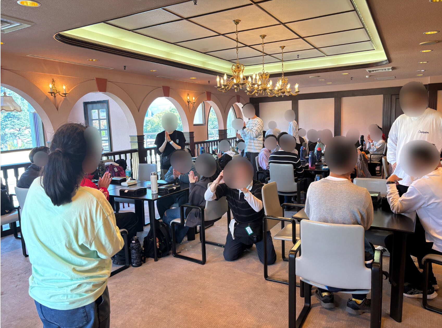 お昼ご飯時刻には、みんなキッチリ「VIPルーム」へ集合、すごい!美味しいお弁当をいただきました。「○○乗った!」「えー、すごーい」「お化け屋敷どうやった?」など、グループごとの情報交換会で、いい雰囲気です。お昼からもまだまだ楽しみます。