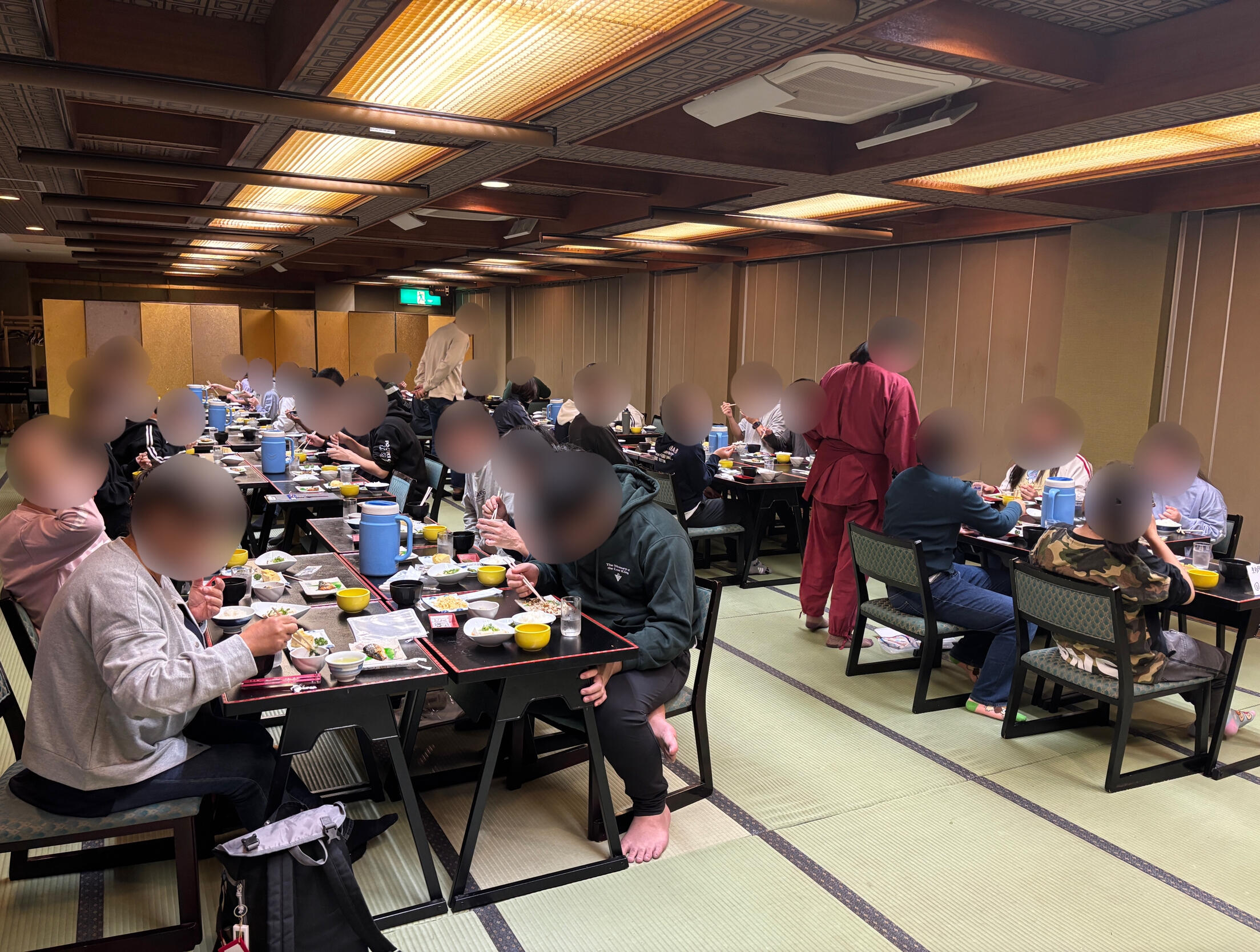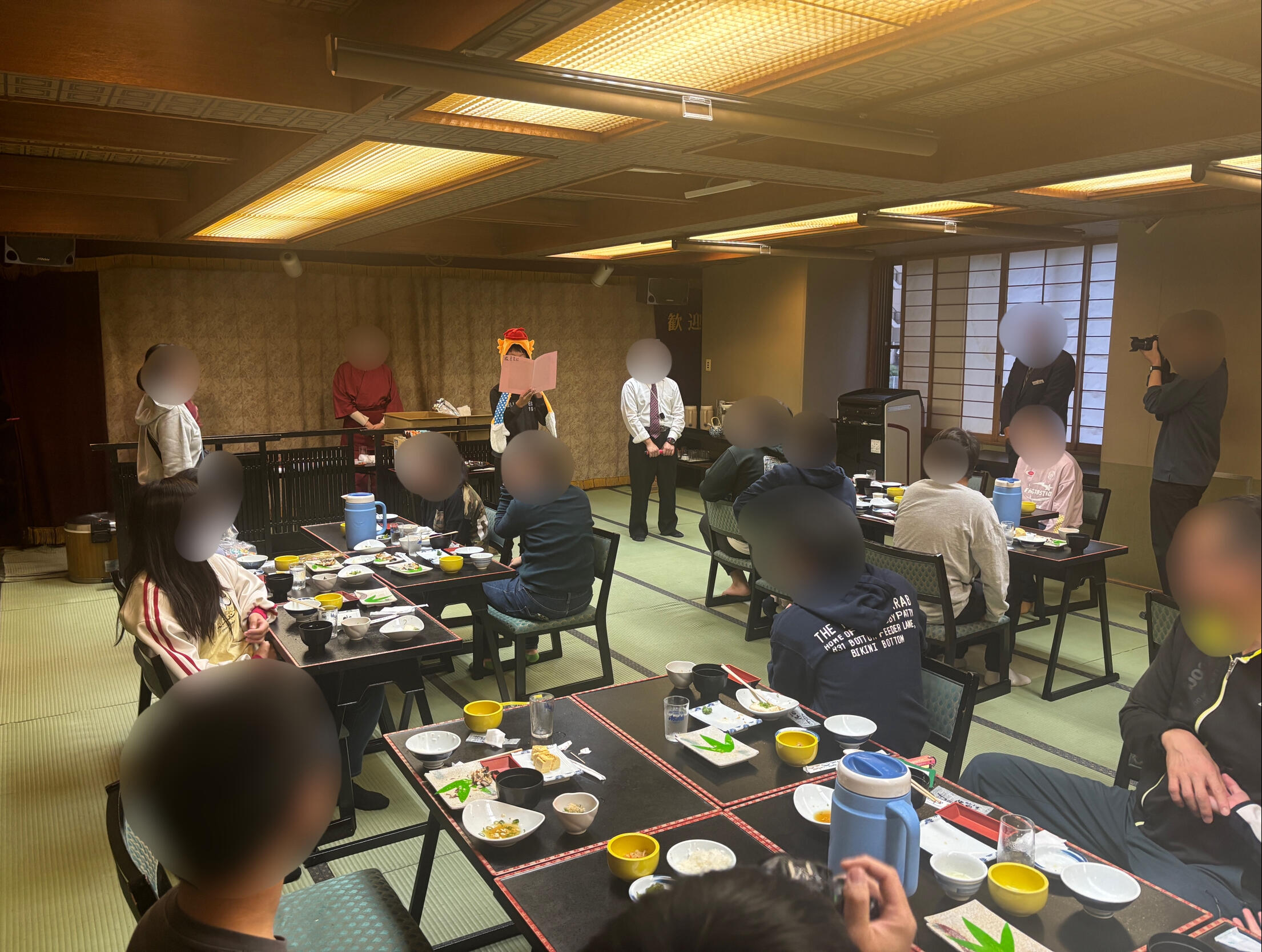朝食は、昨日よりは少しおとなしめのスタート。食が進むにつれ、笑い声も聞こえてきました。食後、会場にて閉所式。生徒代表の合図で旅館の方へ「ありがとうございました」と全員でお礼を伝えました。