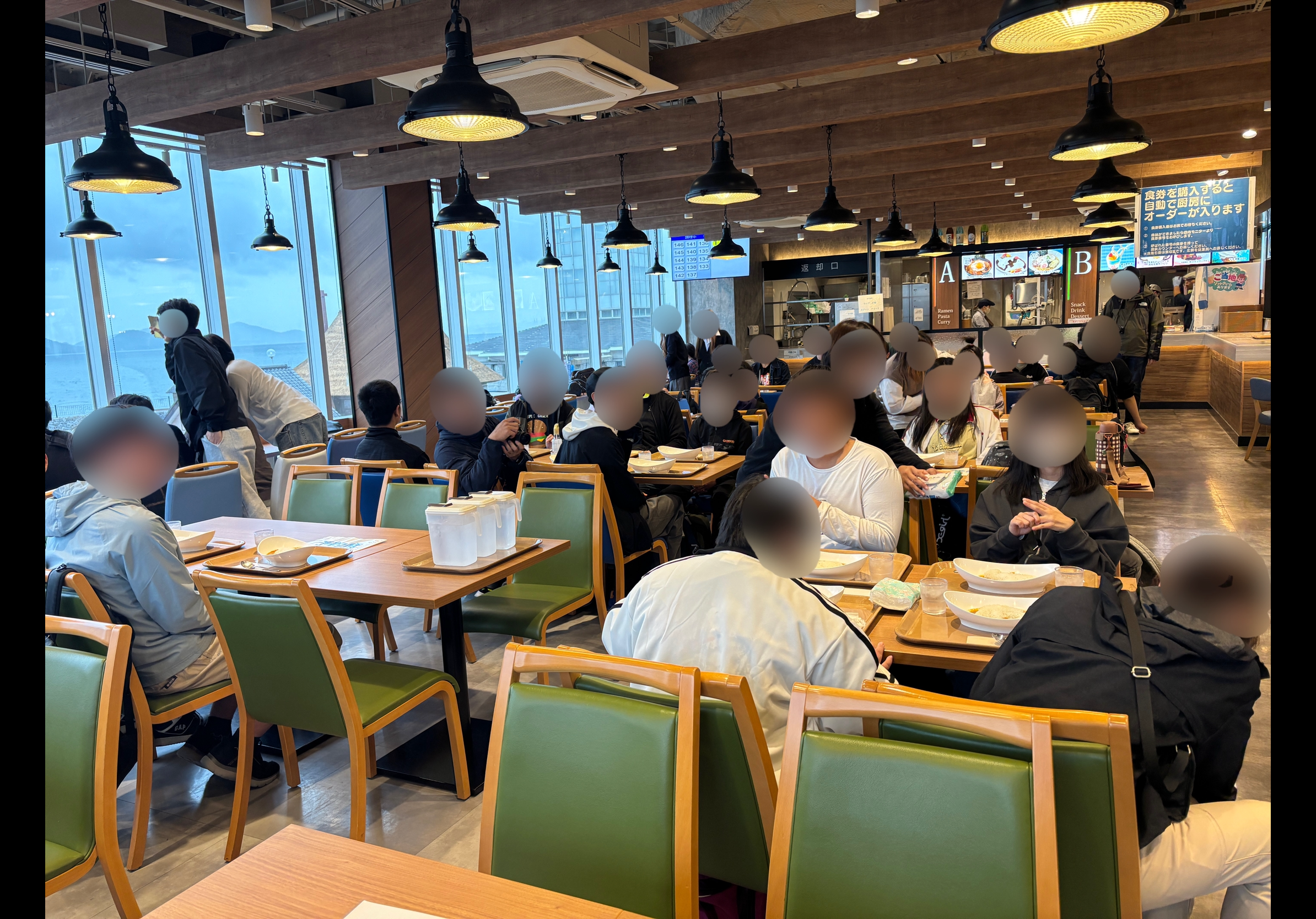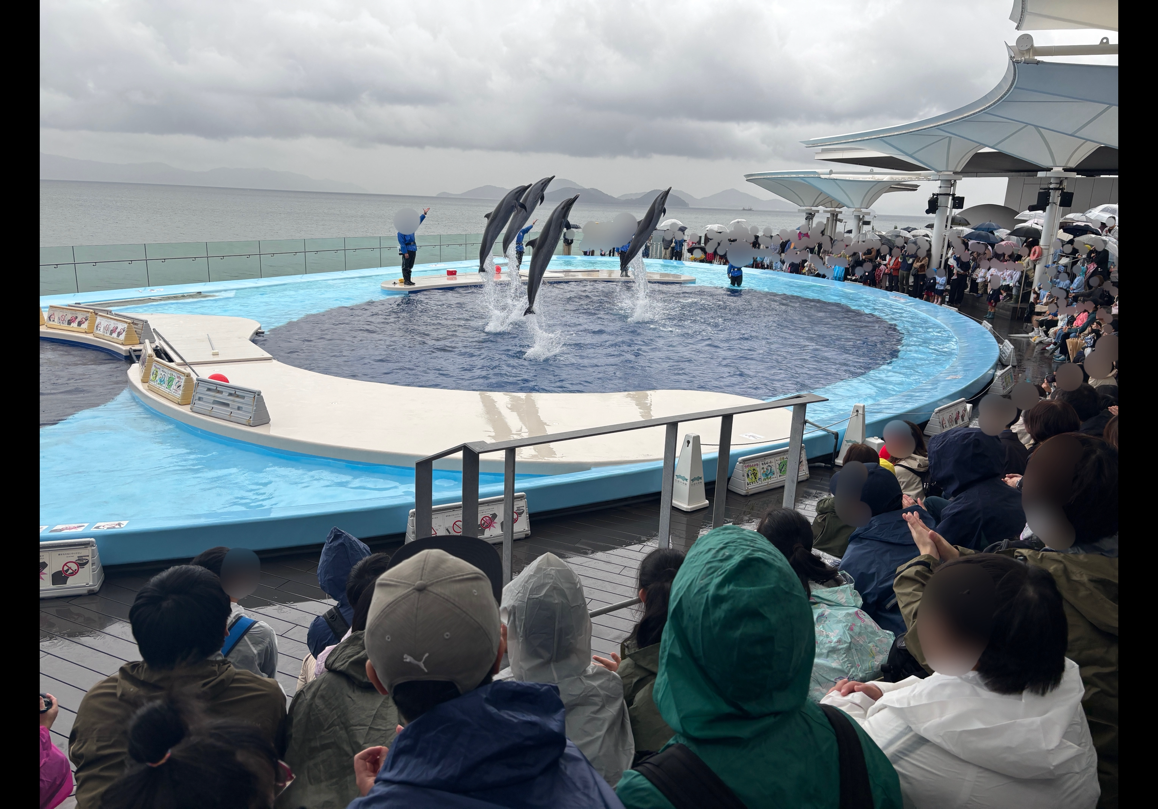 旅館から30分ほどのところにある四国水族館に到着しました。2020年6月にオープンしたばかりの新しい水族館です。雨の影響はそこまで受けず、イルカショーも楽しく見ることができました。お昼ご飯のカレーはあっという間に食べ終わりました。