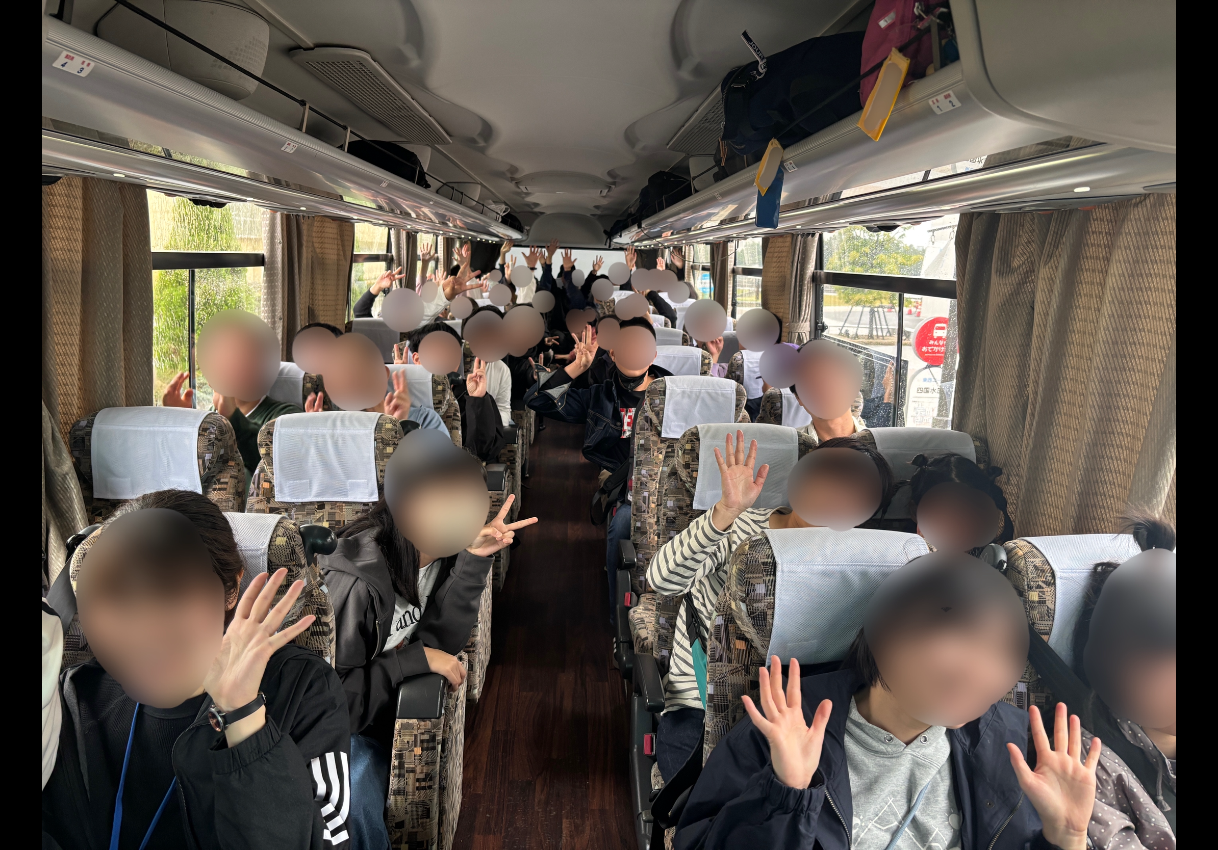 こちら、中学部3年生です。先ほど、昼食を終え、バスに乗って帰路につきました。約30分前倒しでのバス発車です。