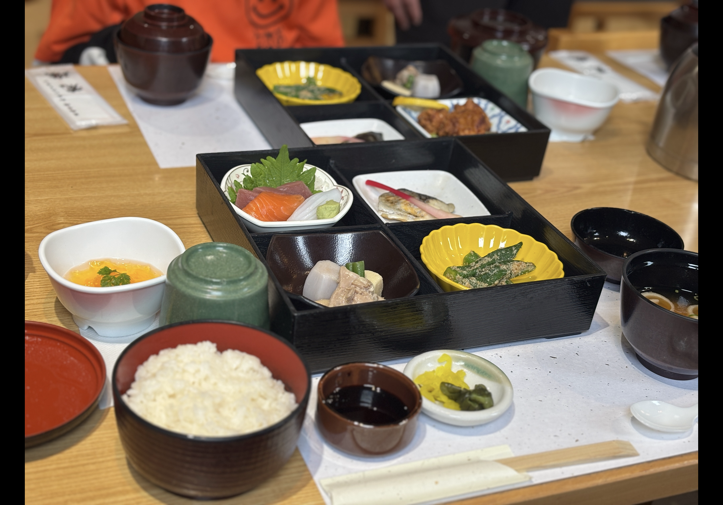 バスは予定より10分早くポルトヨーロッパへ到着しました。まずは黒潮市場で昼食。お刺身と唐揚げの2種のお昼御膳(手前がお刺身、奥が唐揚げ)です。お腹が空いていたのかな...あっという間にペロリです。