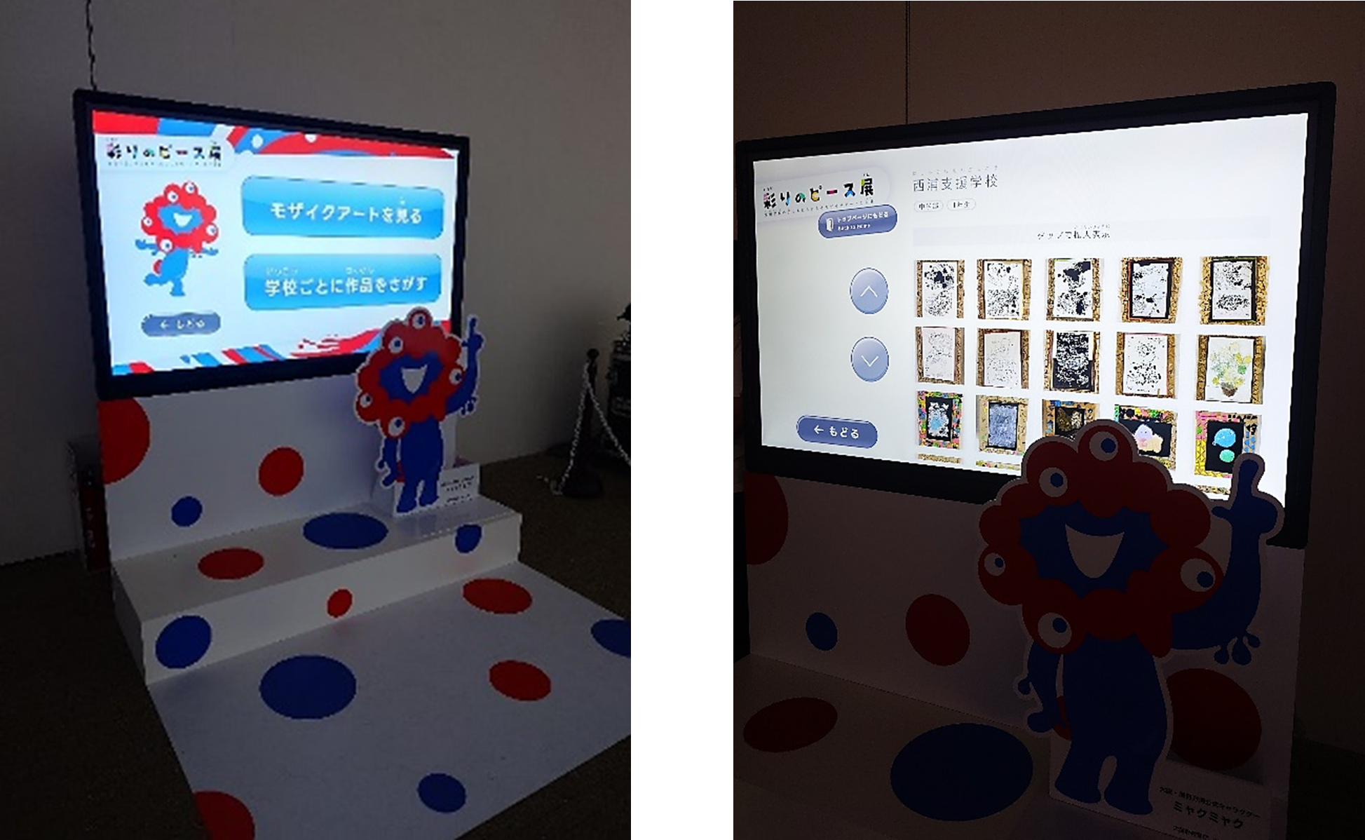 パラパラと移り替わるモザイクアートが楽しい空間でした。また、タッチパネルで各校ごとに作品を見ることができたり、モザイクアートや原画を詳細に見ることもできました。