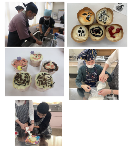 電子レンジやケトルを使ってみるという目標で、グループのメンバーと協力しながらマフィンカップケーキを作りました。今回のテーマ『ハロウィン』に沿って、ハロウィンの装飾をつけたり、かぼちゃやおばけのイラストをチョコペンでデコレーションしたりと、思い思いのケーキが完成しました。最後はみんなで『いただきます』をし、おいしく完食‼そして、後片付けまで協力して行うことができました。