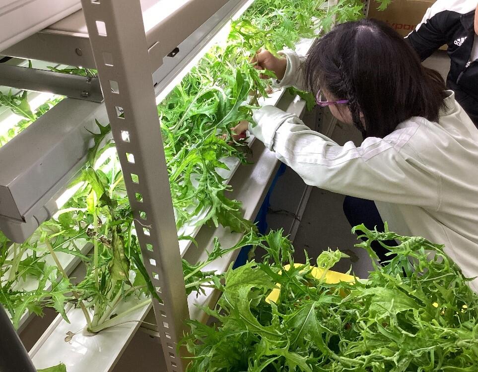水耕栽培室にて、10月31日(金)の給食に使う「水菜」「大葉」の収穫をしました。