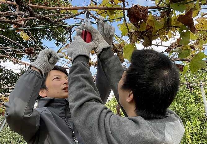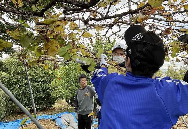 11月26日(水)の高等部職業の時間に、農業2班の生徒がどうみょうじ高殿苑へぶどう栽培実習に行きました。作業内容はマスカット・ベーリーAの「粗剪定」です。12月の剪定に向けて枝を少し短くする作業ですが、皆さん本当によく頑張りました。「新しい枝を根元から60cmの所で切る」という少し複雑な指示内容でしたが、新しい枝と古い枝を見分けるポイント、手のひらを広げて60cmを測る方法などのアドバイスを一生懸命に聞き、実践することができました。長い枝は5m近いものもあり、切った後に引き抜くのが大変でした。