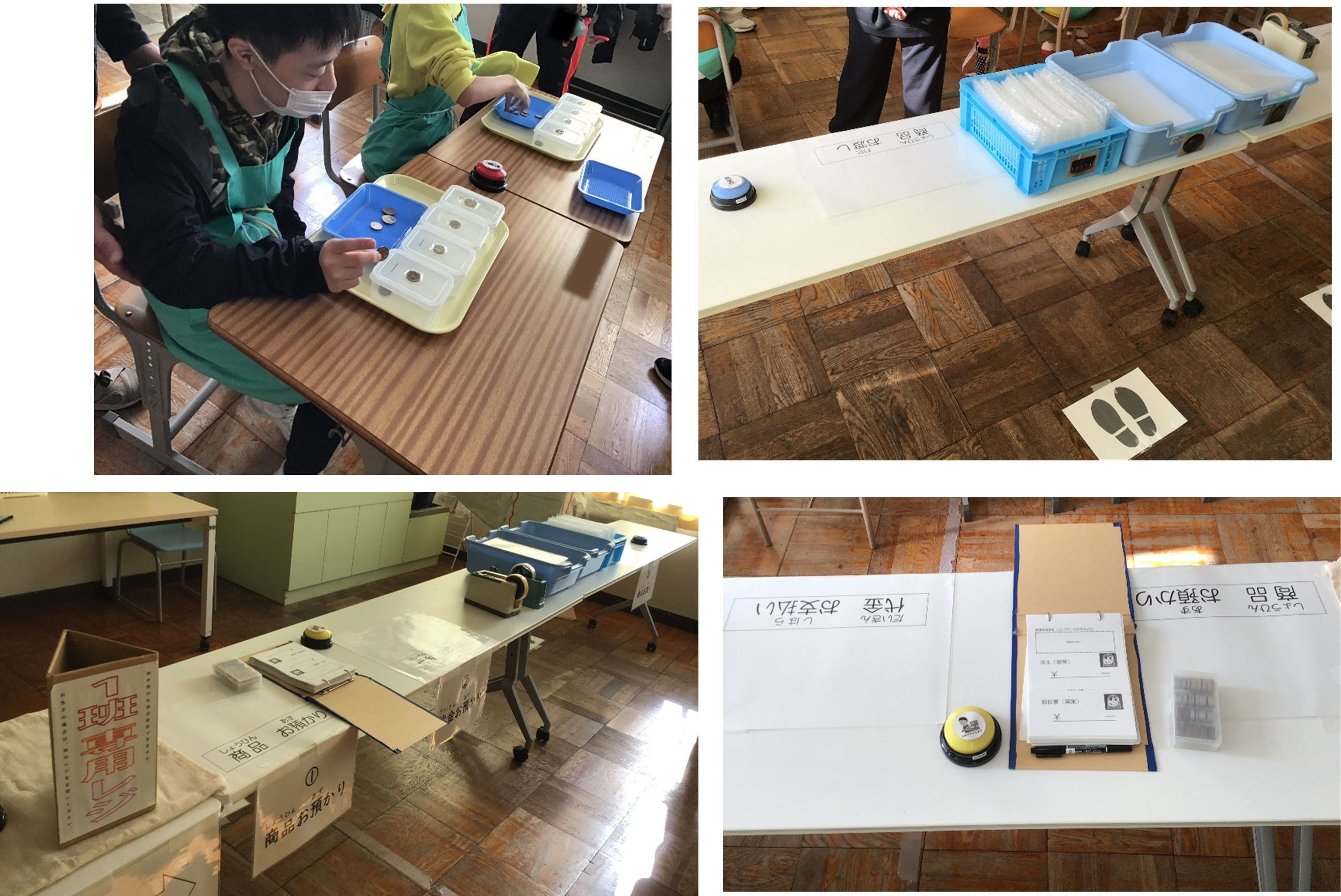 11月後半から12月西フェスに向けて職業授業では、「販売をしよう」と目標を掲げて学習に取り組んでいます。生徒が分かりやすいように手順を決めたり、主体的に活動できるように教材教具を工夫しています。あいさつや接客ができるように音声出力ボタンを使用し、1コーナー1ボタンと活動を精選しています。金銭の取り扱いに関しては、貯金箱形式の教材を使用し、生徒自身で見て分ける活動を主体的に取り組んでいました。また、商品の器のサイズに合わせたプチプチシートの袋を予め作成してあるので、生徒は商品と同じ写真を見て、袋のサイズを選ぶことができていました。テープカッターも自動で切れるもので、生徒が主体的に販売という活動に専念できる環境で学習が進められていました。
