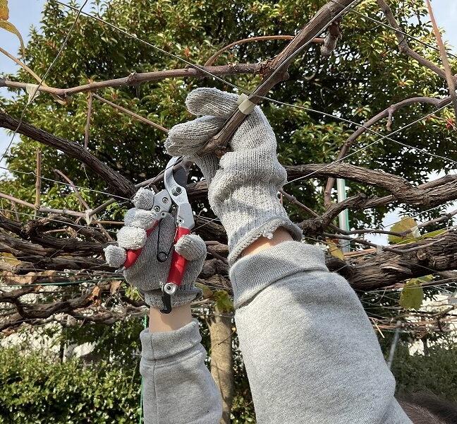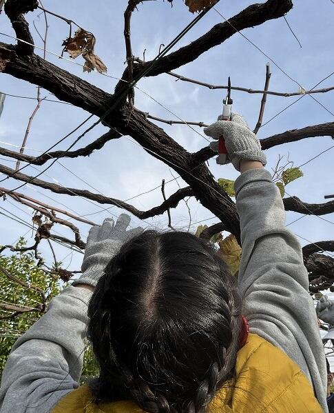 12月10日(水)の高等部職業の時間に、農業2班の生徒がどうみょうじ高殿苑へぶどう栽培実習に行きました。作業内容はマスカット・ベーリーAの「本剪定」です。11月に粗剪定で新しい枝を60cmまで短くしていましたが、それをさらに短く剪定しました。教員たちと一緒に「根本から3つの新芽を残し、その先を切る」という作業を一つひとつ丁寧に進めていくことができました。来週は剪定した枝のうち、発育の悪いものを根元から切る作業を行う予定です。