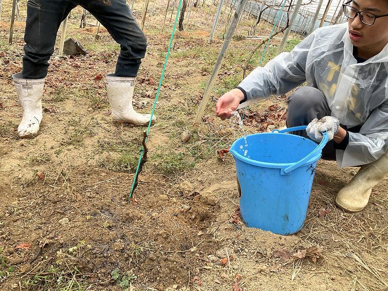 2月25日(水)の高等部職業の時間に、農業3班の1年生が太子町のぶどう農家(丸谷様)の圃場へぶどう栽培の実習に行きました。作業内容はブラックビートというぶどう品種の「定植」です。「定植」は根の環境を整えて生長を促す非常に大切な作業で、「定植」次第でぶどうの樹木の生長速度が大きく変わります。
