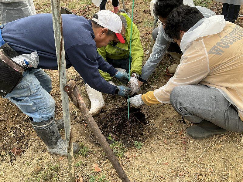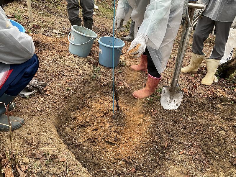 すでに丸谷様が植穴を掘ってくださっていましたが、それでも(小高くバーク堆肥を盛る)→(枝・根を短く切った苗を置く)→(根を均等に広げる)→(支柱に結ぶ)→(バーク堆肥を根に盛る)→(土を盛る)→(足で踏み固める)→(水をかける)→(土を埋め戻す)→(化成肥料と綿実油粕を撒く)→(水をたっぷりやる)とたくさんの作業工程があり、生徒たちは説明を聞いてその通りに作業を進めることができました。