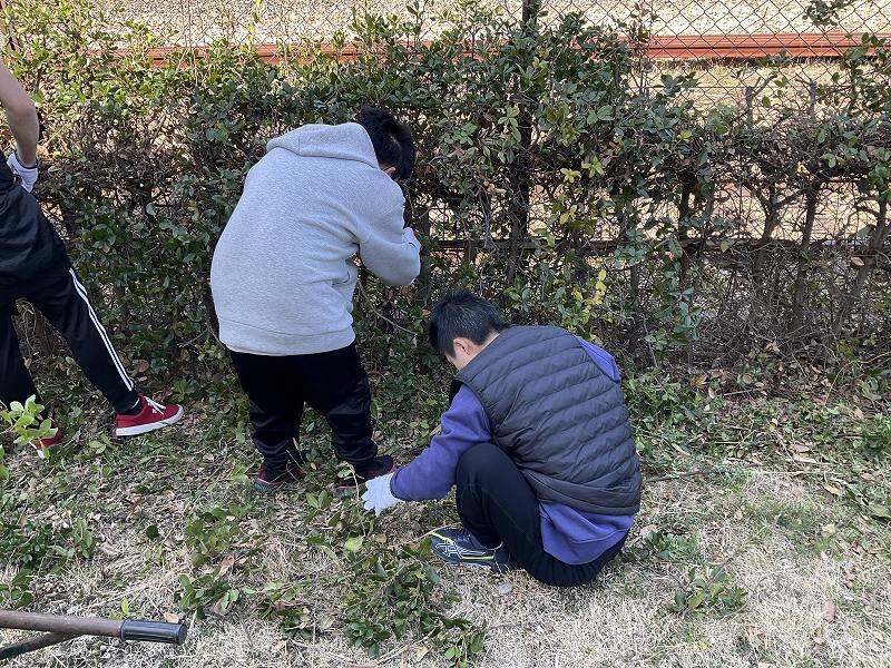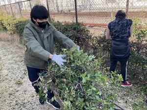 3月11日(水)の高等部職業の時間に、農業2班の生徒10人がどうみょうじ高殿苑へ農作業実習に行きました。生垣の剪定作業の続きを行いました。生垣の枝を切る係、さらに短く切って袋に詰める係に分かれて、ケガをしないように気を付けながら頑張りました。今年度最後のどうみょうじ高殿苑での実習でしたが、ケガもなく楽しみながら取り組んでいました。