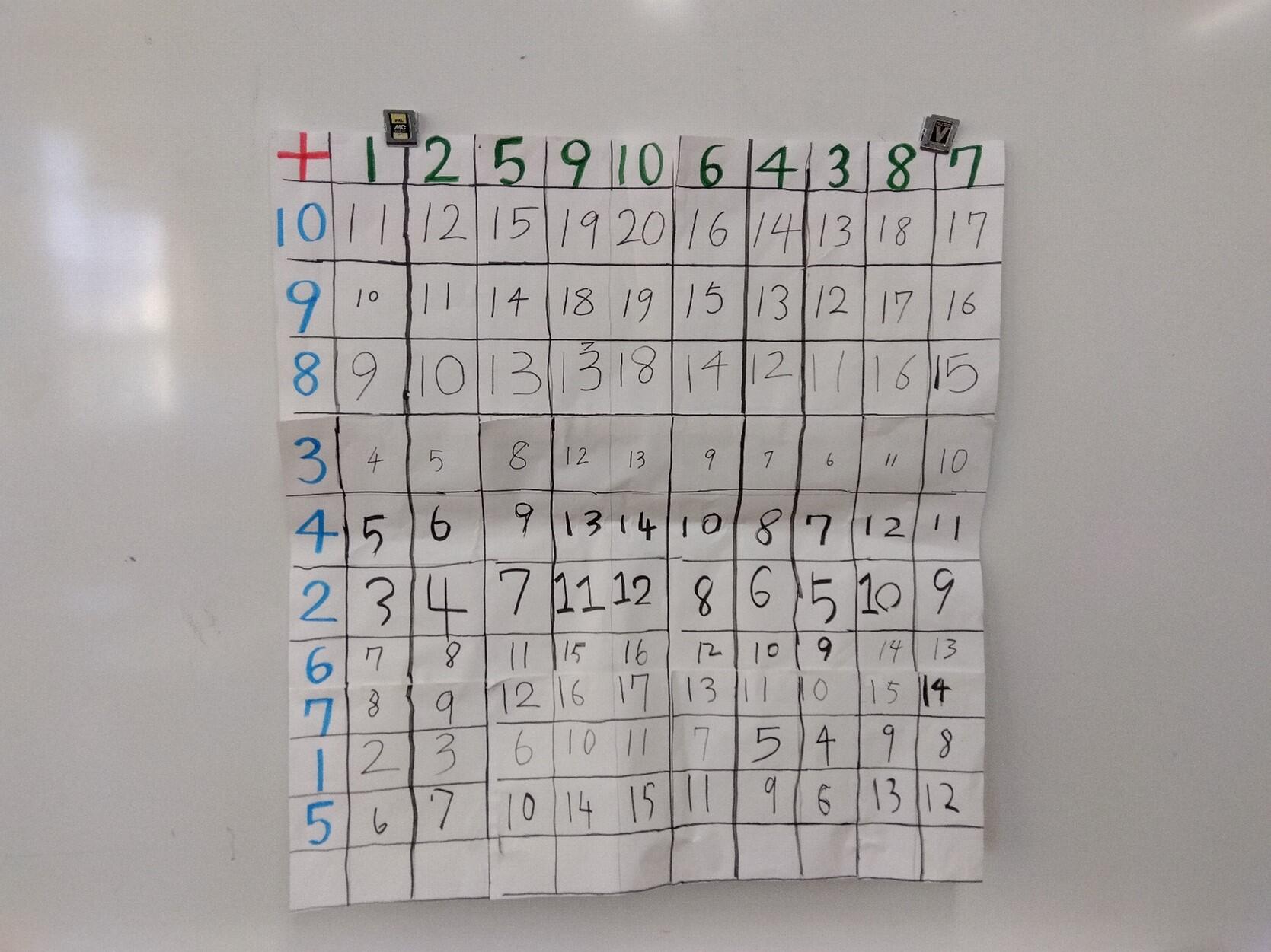 最後の100マスはグループで一つのものを作ろう!と、一人1枚ずつ担当のパーツを作成し、12枚の用紙をつなぎ合わせることで、大きな100マス計算が出来上がりました。出来上がった用紙をホワイトボードに貼り、それを見ながら一人1問ずつ答えを入れていき、完成しました☆