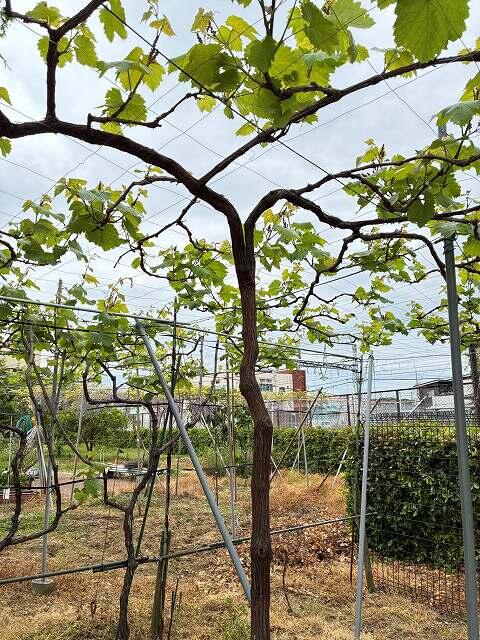 4月22日(水)の高等部職業の時間に、キャリア・フロンティアコースA班の生徒6人がどうみょうじ高殿苑へぶどう栽培実習に行きました。この日の作業は「芽かき」「樹皮はがし」「ツルとり」でした。「芽かき」は同じ場所から複数の芽が出ていれば小さい方の芽をつみとって大きい方の芽が育ちやすくする作業ですが、分からない時は教員に質問しながら作業を進めることができました。樹皮やツルは病気のよりどころとなるので、丁寧に取り除きました。