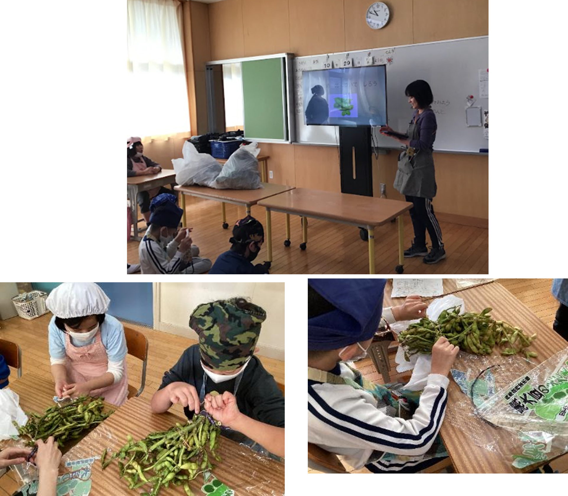 10月29日、小学部6年生が生活科の授業の一環として「えだまめのもぎとり体験」を行いました。栄養教諭の先生が給食で使う黒大豆の枝豆についてスライドを使って説明しました。子どもからは、普段、店に売っている様子を思い浮かべながら「値段はいくらですか?」と質問がでました。