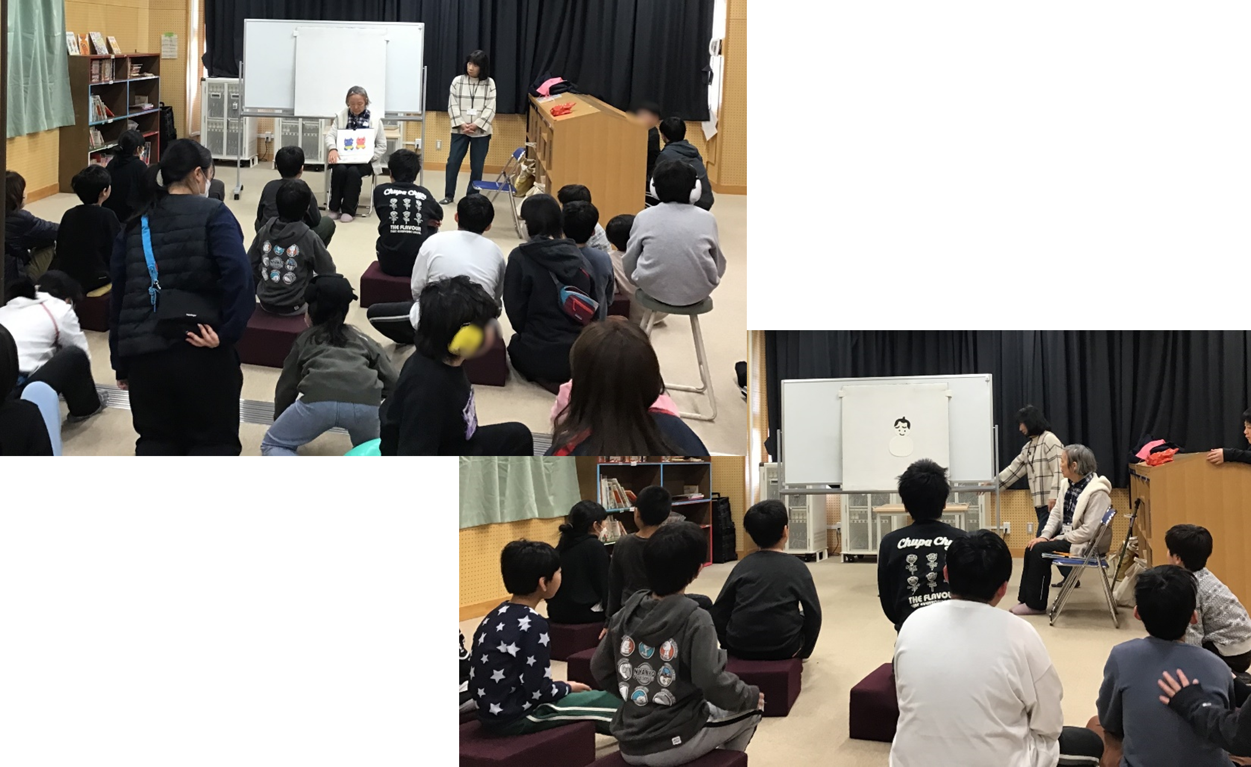 子どもたちは、図書室へ次々に集まってきてボールやクッションなど好きなものに座ります。聞きやすい姿勢でお話に夢中になって聞いています。今月は「ゆきだるまシアター」「ふくはうちおにはうち」絵本「おもちのきもち」。