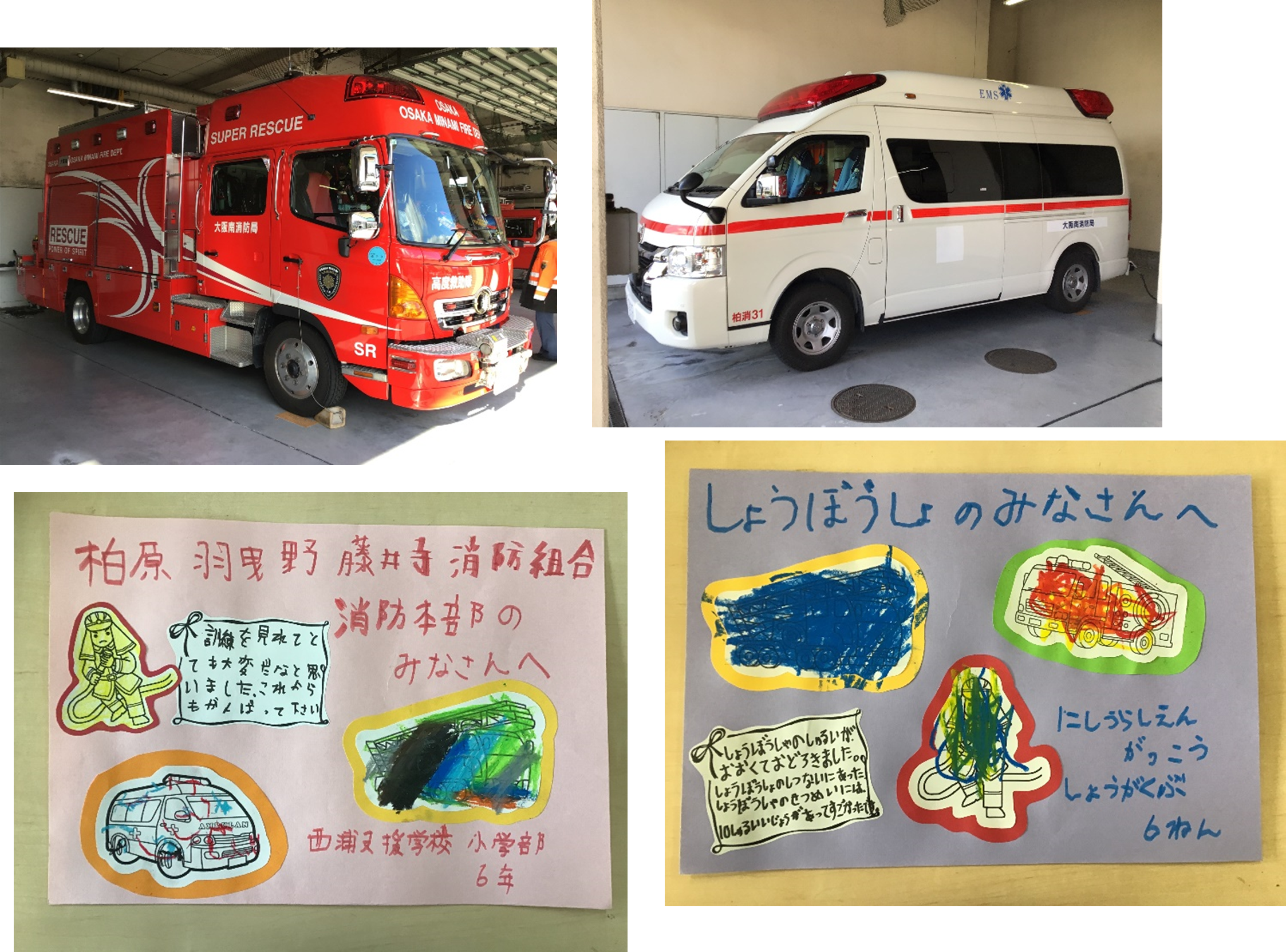 DX地域探求1回目の1月22日(木)に6年生は柏原羽曳野藤井寺消防組合消防本部の見学に行きました。色々な種類の消防車が並んでいてみんな興味津々でした。また、救急車の中に実際に乗ったり、酸素マスクなどの消防士さんが普段使う道具を実際に身に着けさせてもらえたりとても貴重な体験をすることができました。1月29日(木)にはそのような貴重な体験をさせてもらった消防署の方にお礼の手紙をつくり、手渡しで感謝の気持ちも伝えてきました。受け取った消防士の方は「みんなが見えるところに飾っておくね」と喜んでくれました。それを聞いた児童たちも嬉しく、笑顔になっていました。
