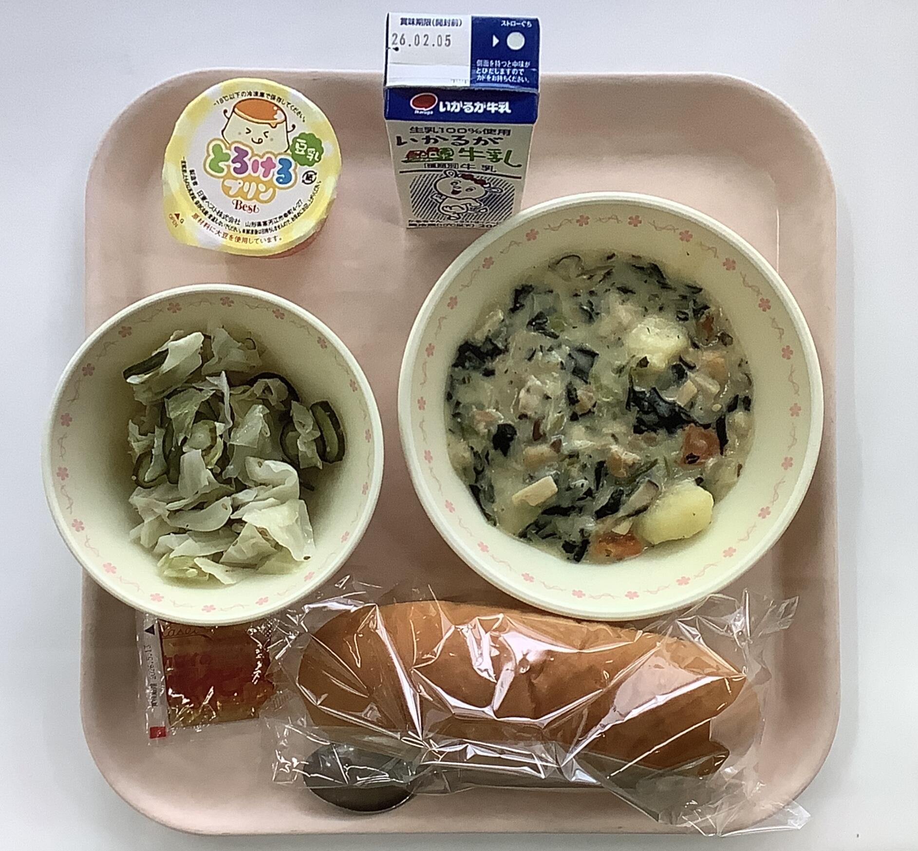 本日の献立は、牛乳、コッペパン(はちみつ)、きのこのクリームシチュー、キャベツのごまサラダ、とろけるプリン(豆乳)でした。