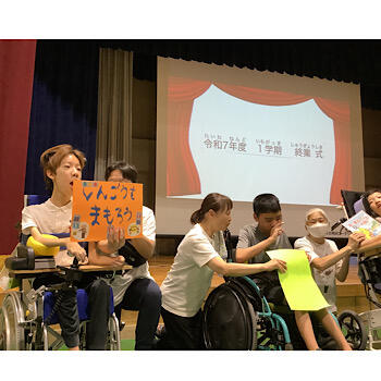 生徒会役員は終業式もしっかり活動!司会進行は生徒会長がおこないました。夏休みの注意事項も児童会と協力して発表しました。