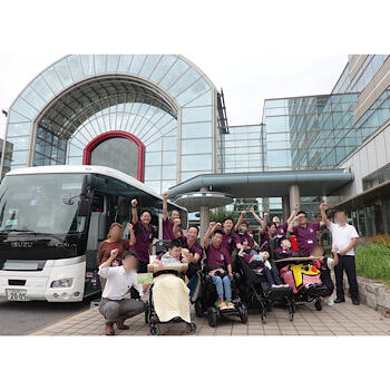 ホテルのロビーで退所式をしてホテル前で集合写真♪