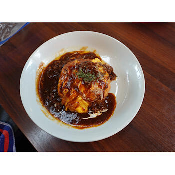 人気No.1メニューの「じっくり煮込んだハッシュドビーフのオムライス」を食べました。とろとろの卵が食欲をそそります。