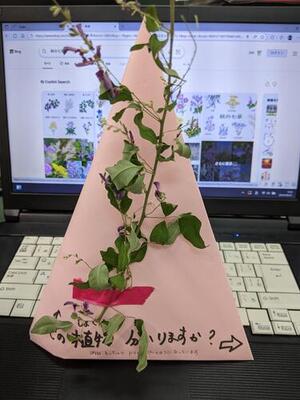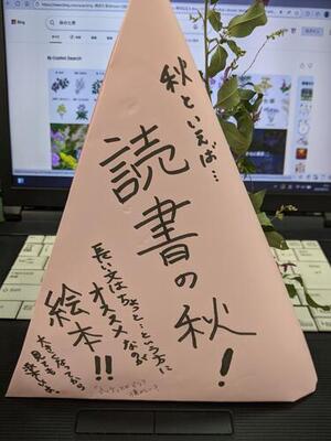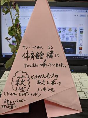 カフェココアルが月に何度か図書館で開かれます。影の司書教諭として、本の特集など展示しています。思いついて萩(はぎ)を飾ってみることにしました。図書館の写真でないのは、作製してPC前で撮って満足してしまったためです。ちなみに、萩は校舎玄関にも一定期間展示していました。体育館横で咲いています。