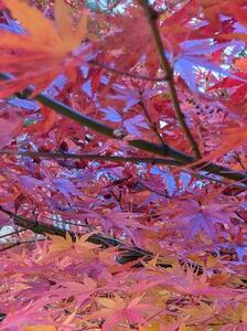中庭のイロハモミジです。紅葉狩りといえば、この木でしょうか。モミジはカエデの仲間(ムクロジ科)で、葉の切れ込みが深いものをさすようです。手のひらの形に5~9ほど切れ込みがあります。特に7つの切れ込みが多く、「いろはにほへと」と数えたことが名前の由来になっています。