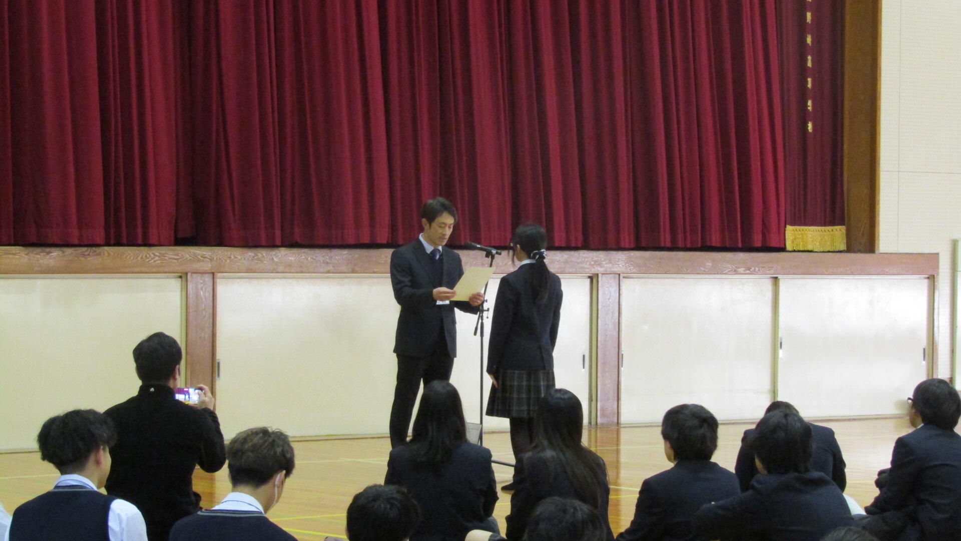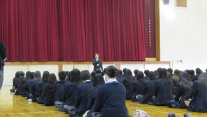 校長先生と生徒支援部の先生から、今年度の振り返りと来年度に向けてのお話がありました。 また、日頃から自分を支えてくれている人への感謝の気持ちを持つことの大切さについてもお話があり、生徒たちは真剣に聴いていました。