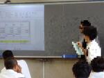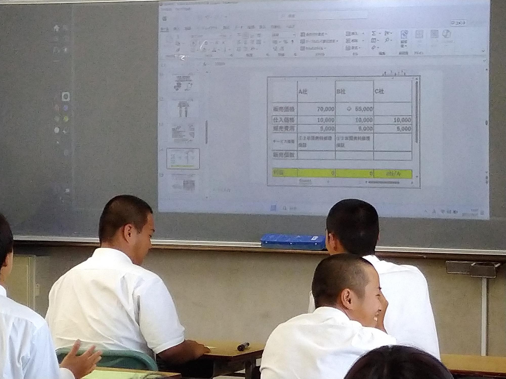商品販売が寡占になっていないか、価格設定が適正に行われているか等、消費者の視点にたって見守っているといった業務の話をしていただいた後に、数人の生徒が、3つの事業者となり、携帯電話の販売価格を設定し、クラス内の他の生徒(顧客)に、どの事業社の提案(価格)で携帯電話を購入するかを挙手(意思決定)してもらいました。意思決定の数は少なくても、利益は十分な販売結果が出る等、各事業者の売上を確認するといった流れで授業は進められました。