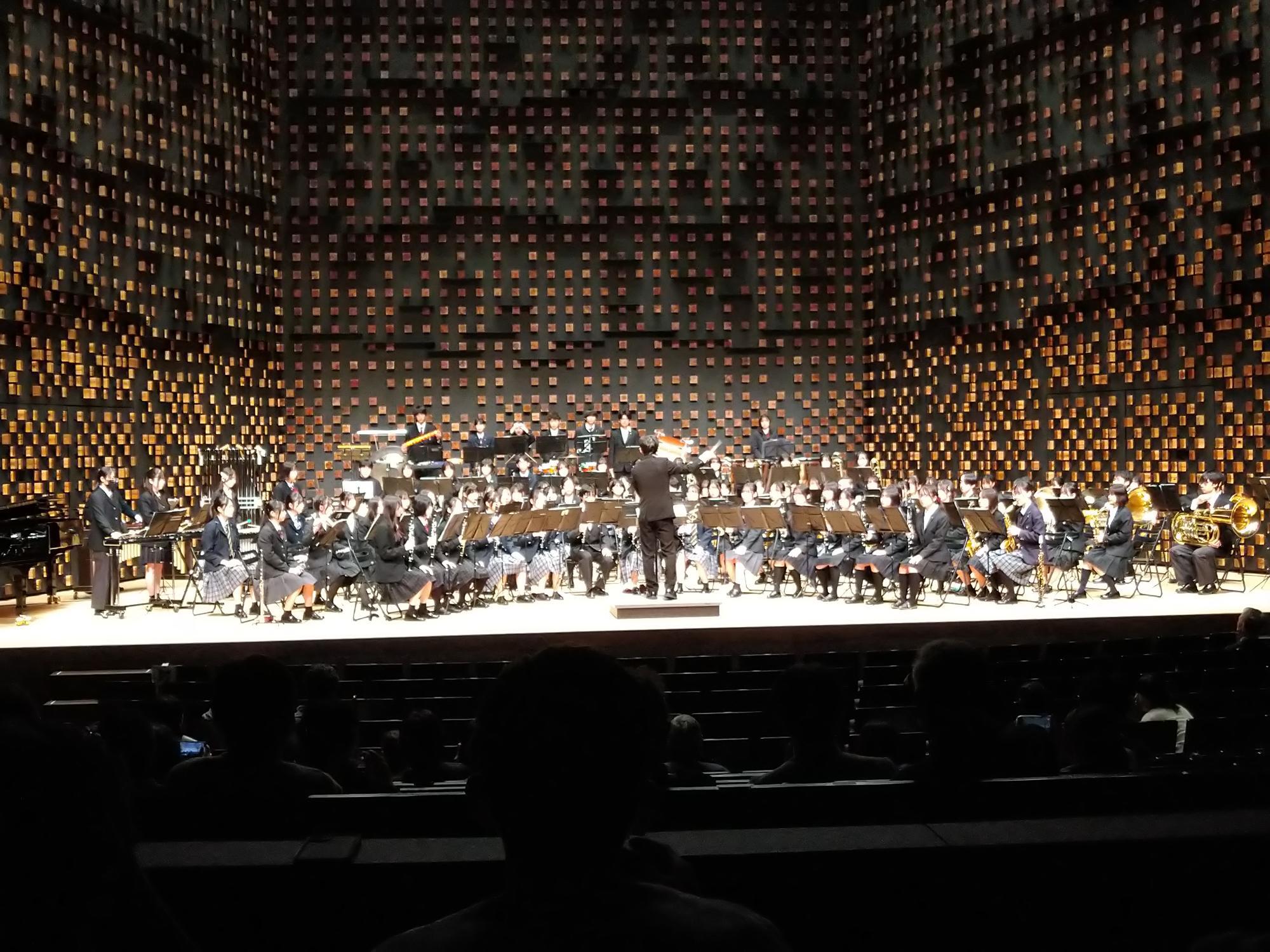本校の演奏では、大塚 愛さんの『さくらんぼ』。軽快な演奏に、また、フレーズがリピートする場面では、会場からの『もう1回』を期待して、・・・?! 初々しく指揮を振り、少し照れながら指揮棒を振っている様子が観客席にも届いていました。2曲目は、ジャパニーズ・グラフティⅨと題して、山口百恵さんの曲を、『秋桜(コスモス)』、『いい日旅立ち』等を聞き入り、口遊んでいました。3曲目は、熊本民謡『あんたがたどこさ』を交響詩に、楽器の掛け合いや、テンポの変化、変調等々、肥後の山里に、夕日が差し込み、旅人が子どもたちに道を聞くもお道化ながら、掛け合っている、そんな情景が浮かんでくる演奏でした。