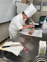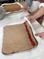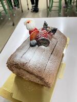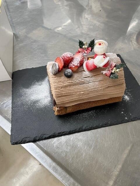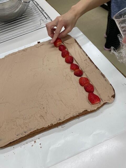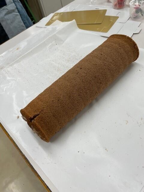 大阪調理製菓専門学校 ecole UMEDA から講師をお招きし、クリスマス直前、ケーキ作りを教えていただきました。部員(5名)と顧問の先生方も一緒に挑みました。 まずは、チョコ味のスポンジケーキを焼き上げ、クリームを塗りこみ、イチゴをたっぷり挟み込み、ロール状に成形。(力加減が難しい~) 粉雪状にデコレーション、サンタとイチゴをトッピングして完成。 みんなで美味しくいただきま~す。(私もお裾分けいただきました。)