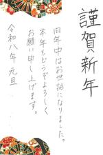 仕事始めの今日、生徒から賀状が届けられました。 3年生の『生活に活かす書』では、ペン字中心の授業を行っており、筆ペンの学習を踏まえて、"千代紙を使って華やかな装飾と共に作品作り" をテーマに、大冠の先生を送り手に想定し、2学期末に作成されたそうです。 私の処には、千代紙で『水の流れ』を絶妙に表現し、その枠を沿うように、文字を配置する等の工夫を凝らした作品や、丁寧に書き上げられた作品が届けられました。 日頃お世話になっている先生方に、気持ちを込めた新年の挨拶が届けられたそうです。