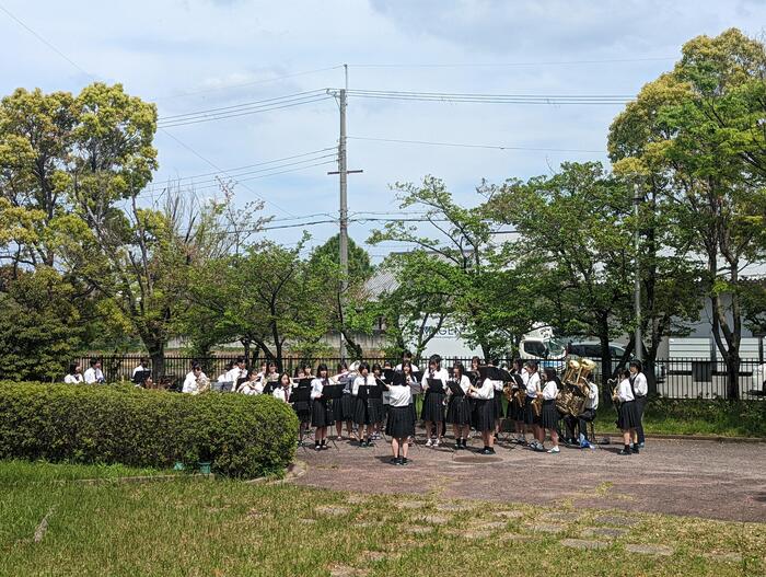 本日の昼休み、中庭にて吹奏楽部による「昼休みコンサート」(略して昼コン)が開催されました。なぜ中庭か?というと、コの字型の四階建て校舎の利点を活かし、HR教室前の廊下から鑑賞することができます。本日は、新入生の部活勧誘のメッセージも込めた力強い演奏を披露してくれました。昼休みに生徒達からパワーを貰い、午後も頑張るぞ!