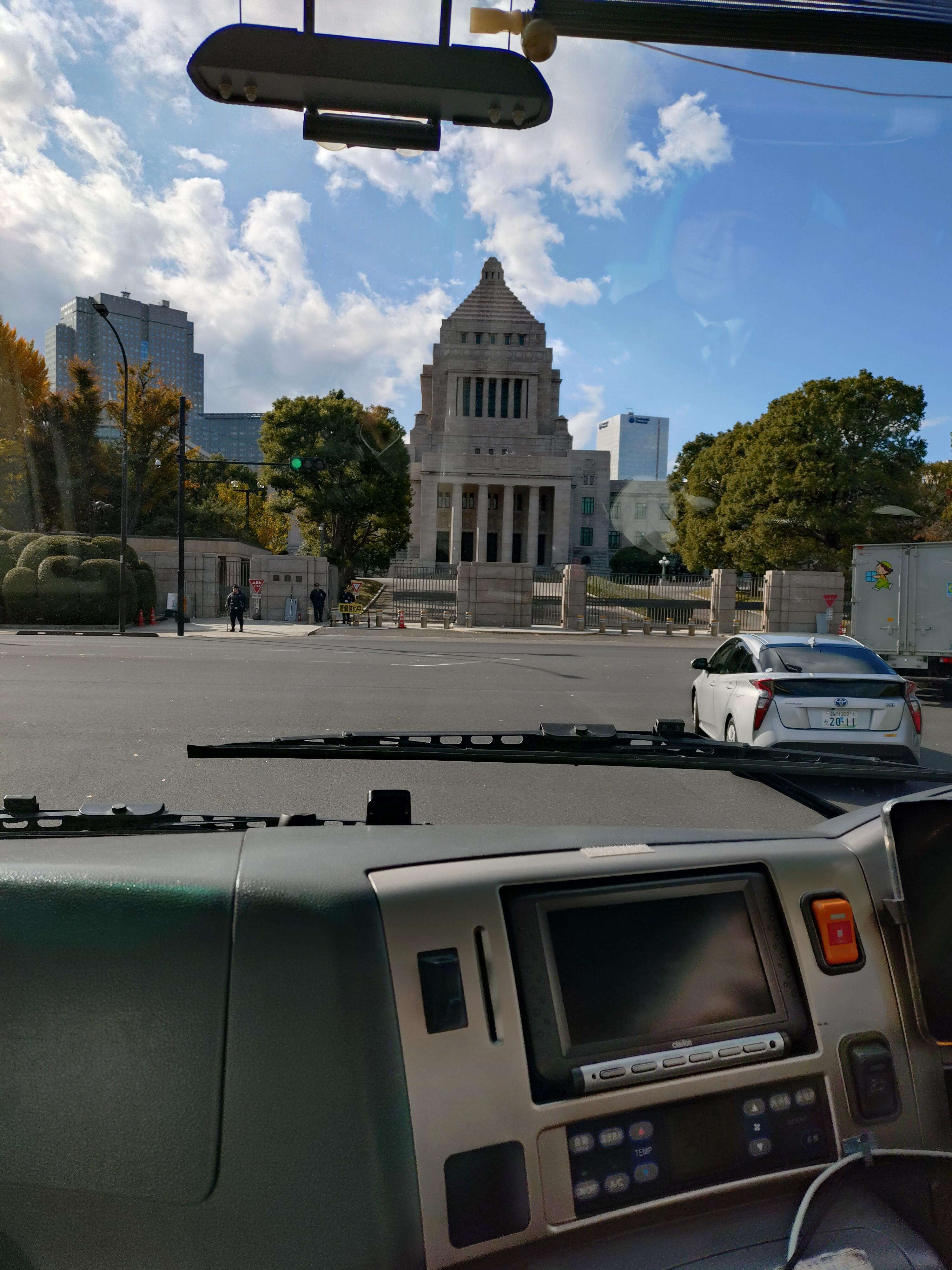 日本の首都、東京に到着。次の目的地まではバスで都内を観光。初めて来た生徒は、テレビや写真で見たことのある建物や地名の標識に興奮気味。国会議事堂や国立競技場が見えると、おお〜と声があがってました。 皆、元気です。