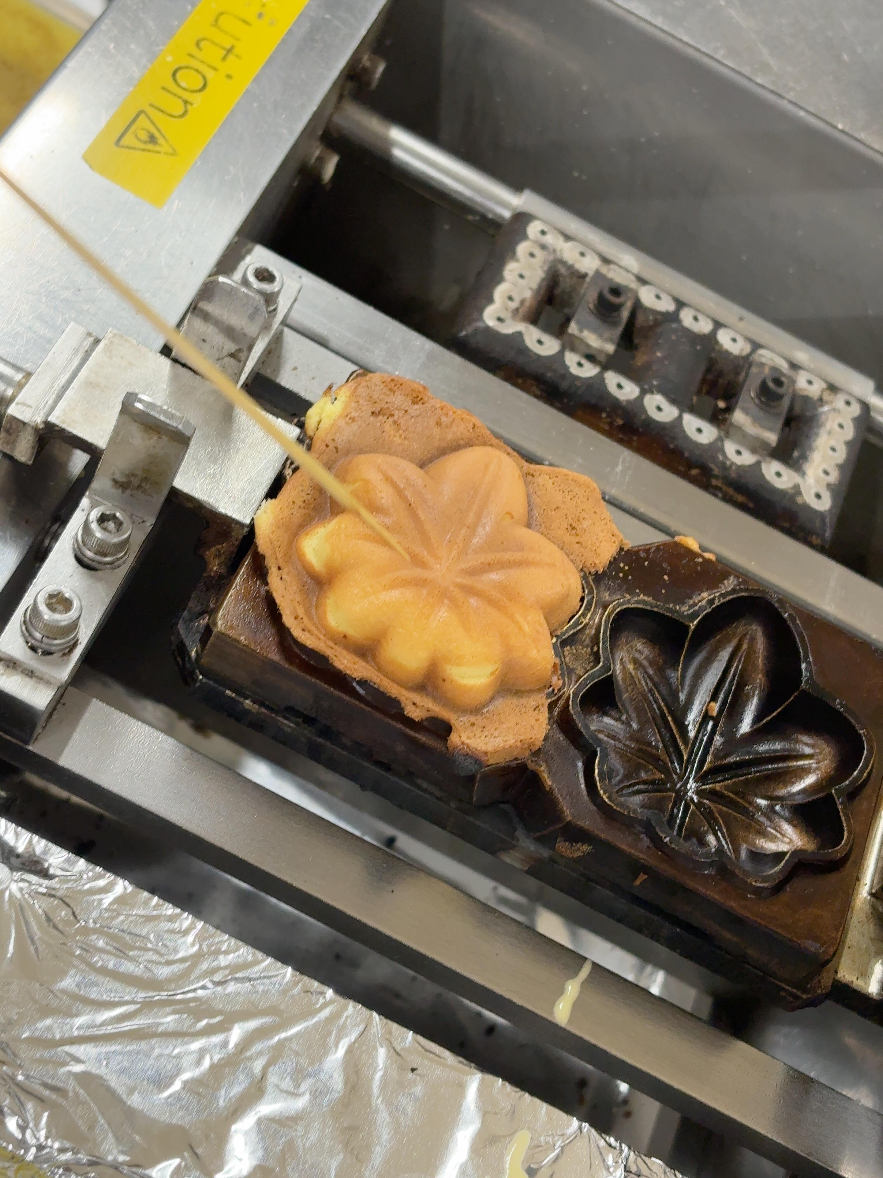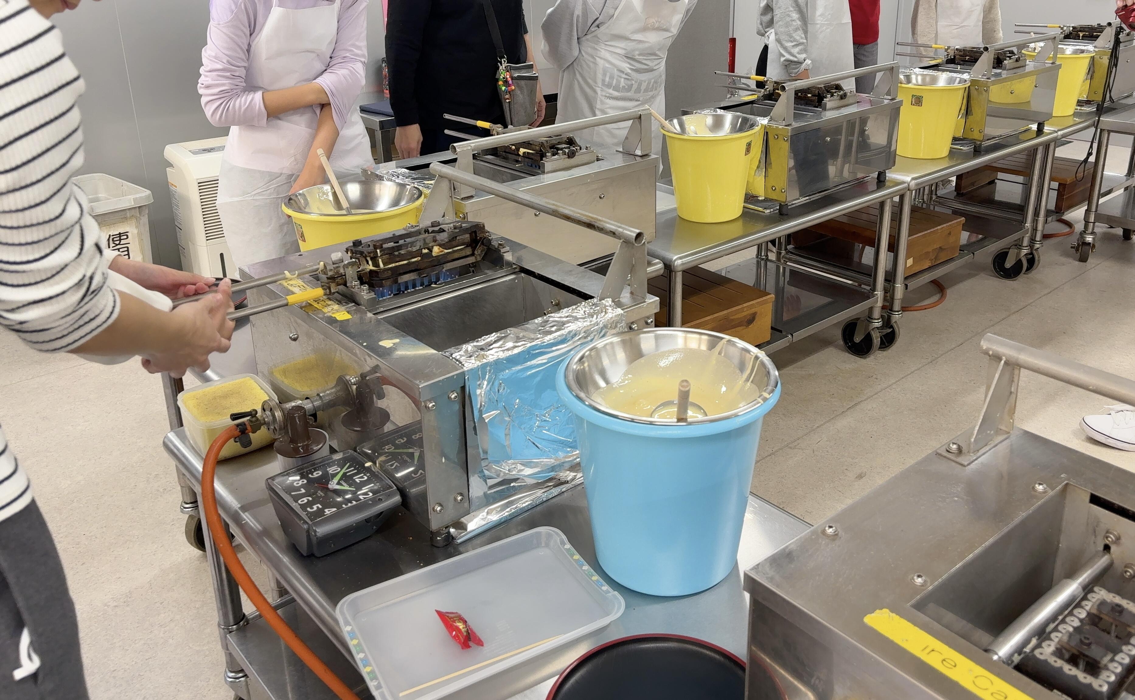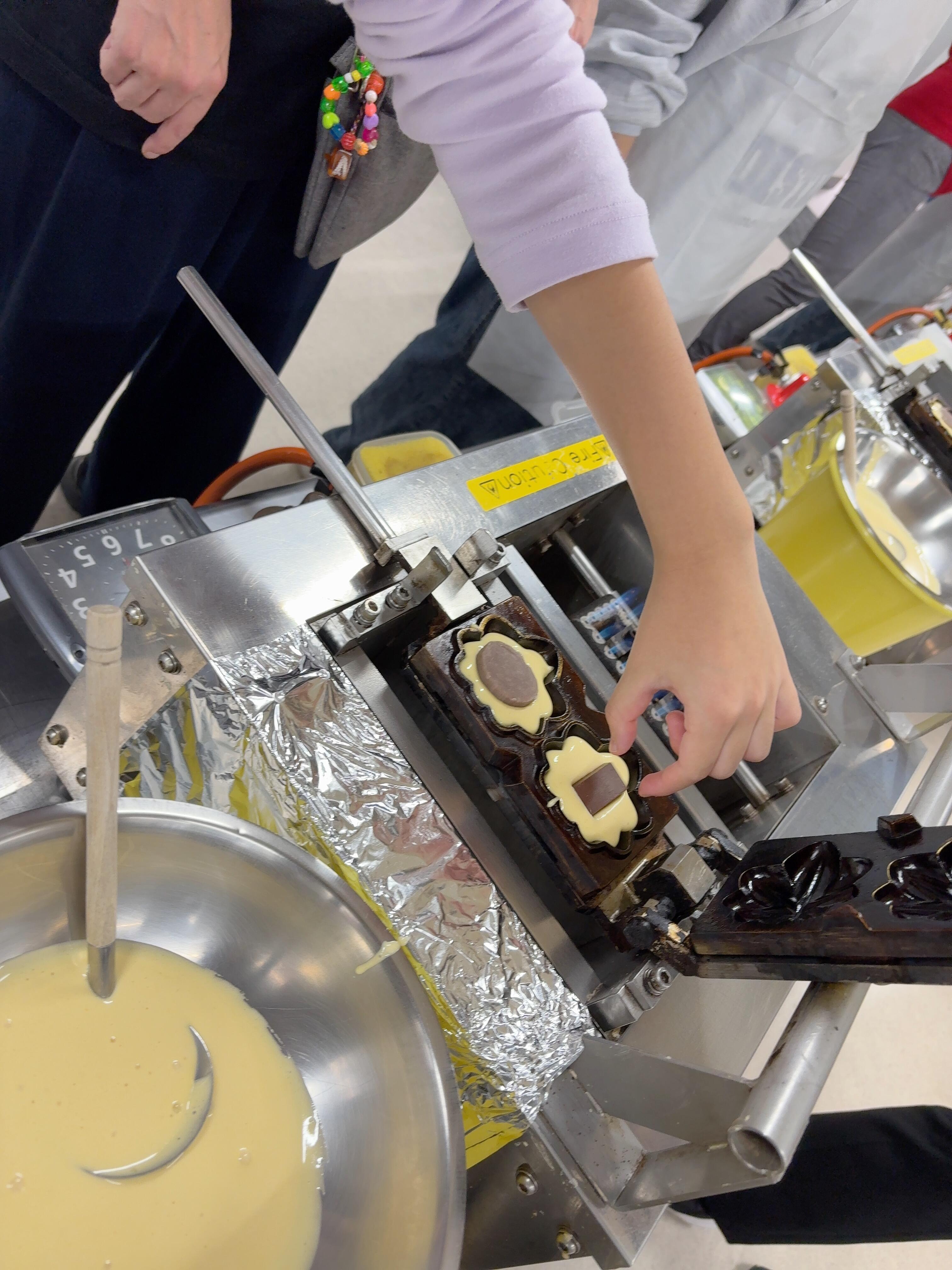 世界遺産を堪能した後は、もみじまんじゅう焼き体験へ。 それぞれエプロンをつけ、焼き方についての説明を真剣に聞きました。 生地を流し込む時、型からあふれるまで豪快に流す子どももいれば、慎重に少しずつ流し込む子どももいて、みんな一生懸命でした。 時計と睨めっこしながら30秒ごとにひっくり返すことを繰り返し、ようやく完成。 おいしそうなもみじまんじゅうが出来上がりました。
