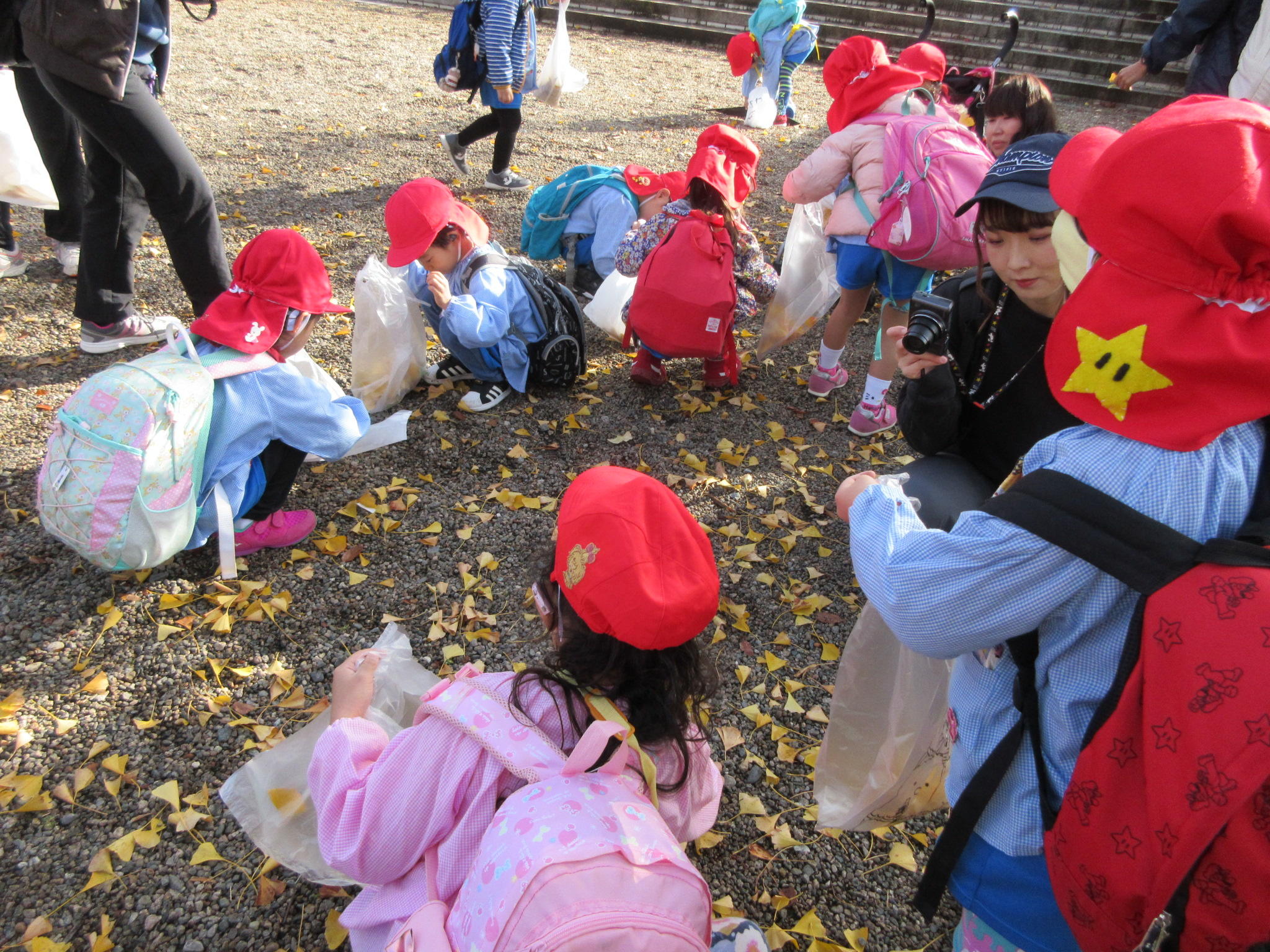 子どもたちは、たくさんのどんぐりやまつぼっくりを拾い、「見てー!!」と袋の中を見せてくれました。お弁当を食べた後は鬼ごっこをしたり、木登りをしたりして遊びました。木登りをする時にはサルの顔まねをしている子もいました。