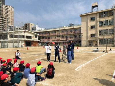 大阪府警東警察署の方と、中央区役所のゆめまるパトロール隊の方にお越しいただき、安全な道路の歩き方や自転車の乗り方についてお話を伺いました。