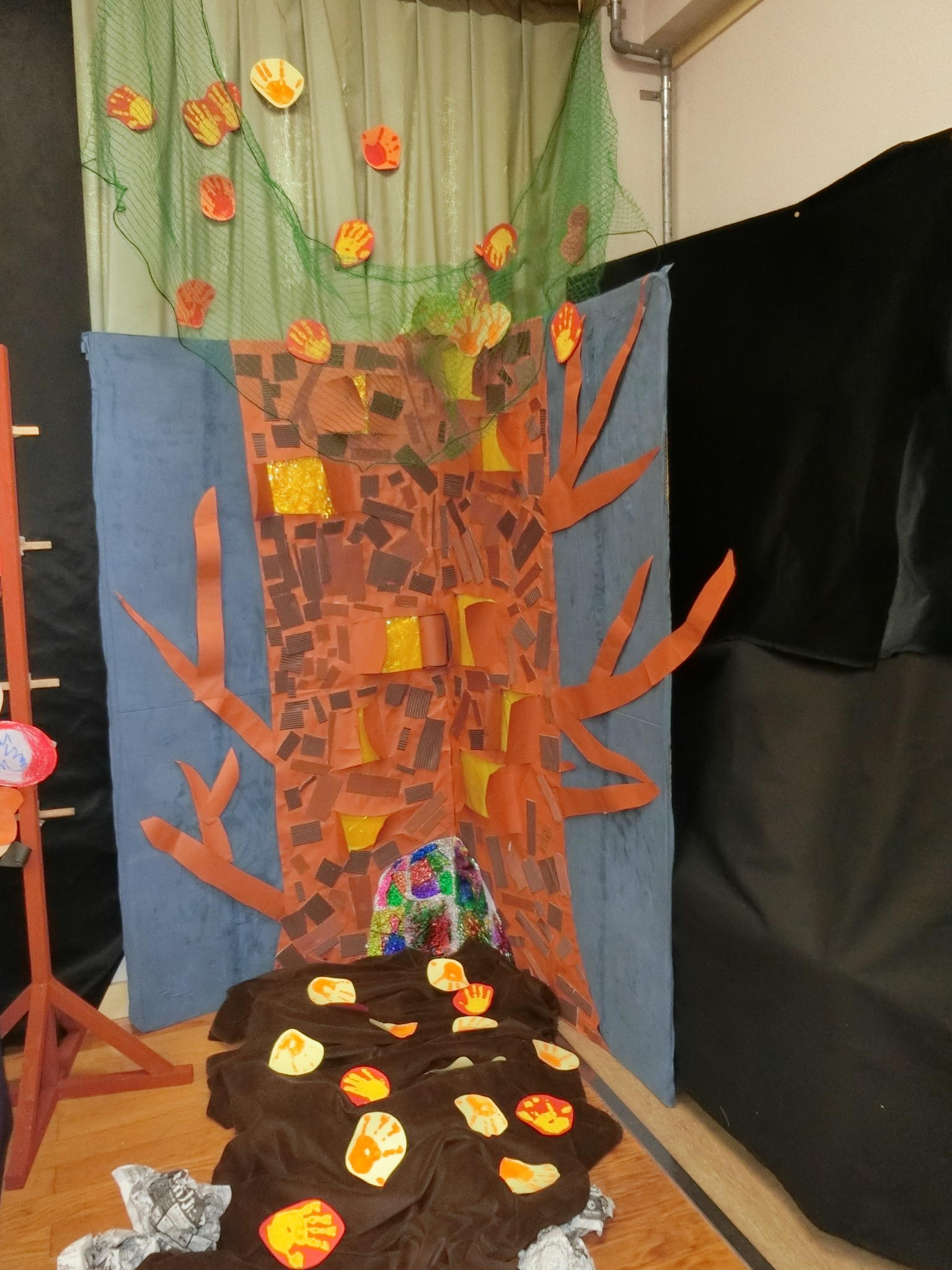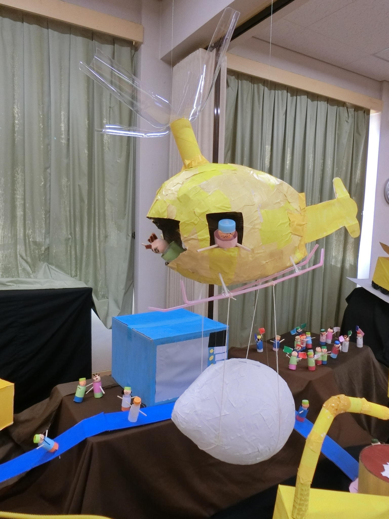 各クラス1つ絵本を決めて作品を作りました。大好きな絵本の世界を、お友だちや先生と一緒に考え、工夫して作り上げました。素敵な作品がリズム室いっぱいに飾られました。作品展当日は、保護者の方と嬉しそうに見て回る子どもたちの姿が見られました。