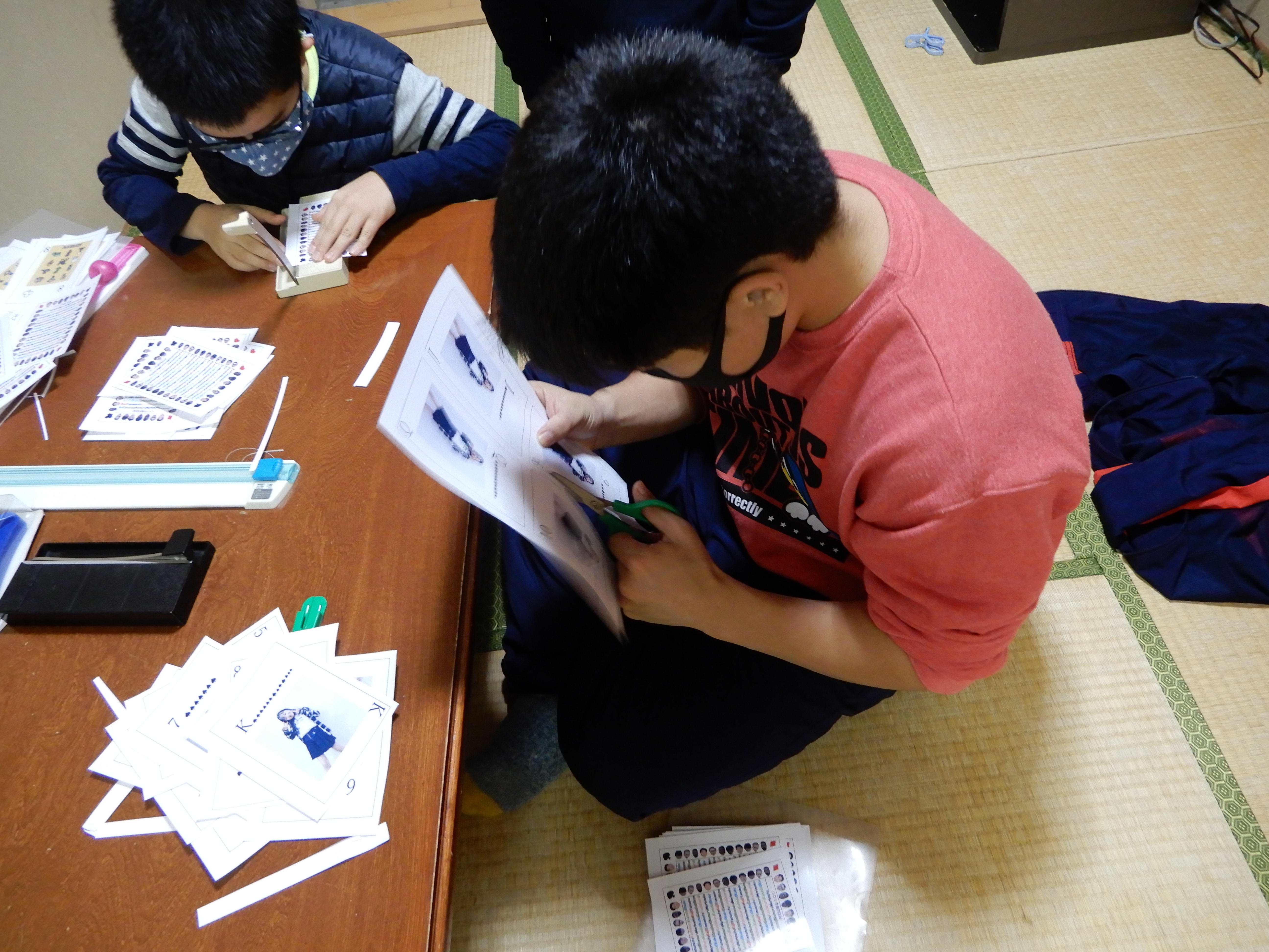 パソコンクラブでは、トランプ作りが佳境に入ってきました。印刷した物を線通りにまっすぐ切ったり、ラミネーターに通したりしました。徐々に完成に近づくにつれて、舎生も実感できたのか笑顔になってきていました。来週に完成させて12月のクラブ活動で、そのトランプを使っていろいろ遊びたいと思っています。