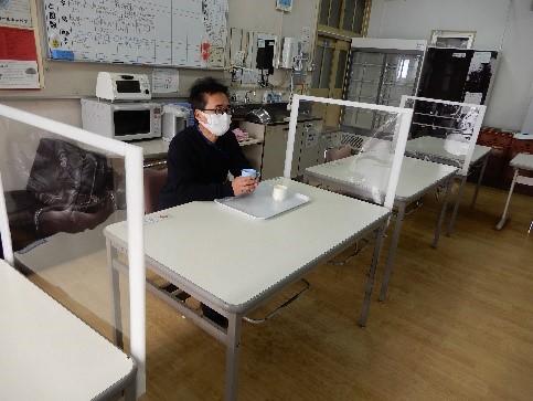 寄宿舎では食事前後のアルコール消毒に加えて、パーテーション(食後にアルコール消毒を行います)を使って感染症対策をしています。初めて使うときは「何これ?」と戸惑うかなと心配していましたが、受け入れていつものように食事をしていました。