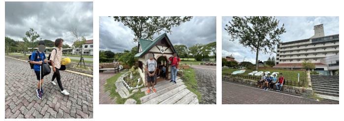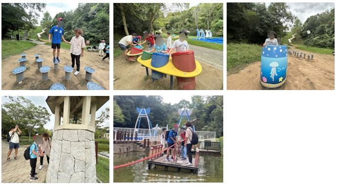 日本庭園の散策のあとは、雨の予報もあったため、予定を少し早めて「トリム園地」へ向かいました。 生徒たちが楽しみにしていた長い滑り台は、雨で濡れていたため残念ながら滑ることはできませんでしたが、イカダやターザンロープ、その他の遊具で思いきり遊ぶことができました。 特に、イカダに乗るときには、みんなで声をかけ合いながら紐を引っ張り、協力して進むことができました。水面で揺れるイカダは迫力満点で、良い思...