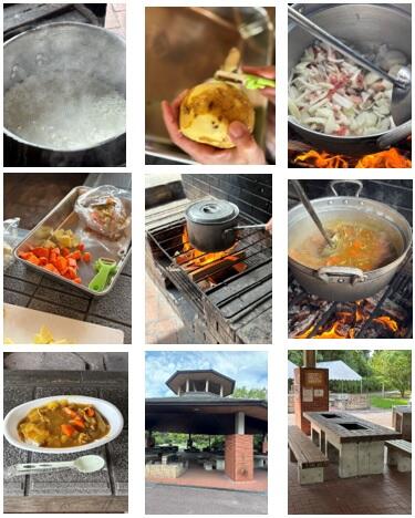 飯盒炊爨(はんごうすいはん)では、みんなでにんじんや玉ねぎを切ったり、竈門に木を組んで火をつけたり、ご飯がうまく炊けているかドキドキしながらお鍋の音を聞いたりして、カレーを作りました! いろんなことがありながらも、おいしいカレーができました!